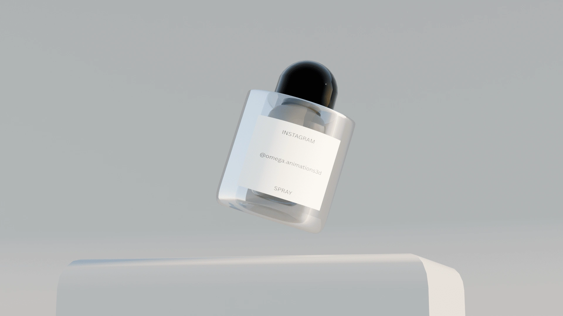 A modern and minimal 3D render of a perfume bottle. Clean lines, soft lighting, and subtle reflections create a calm, elegant vibe with a custom label.