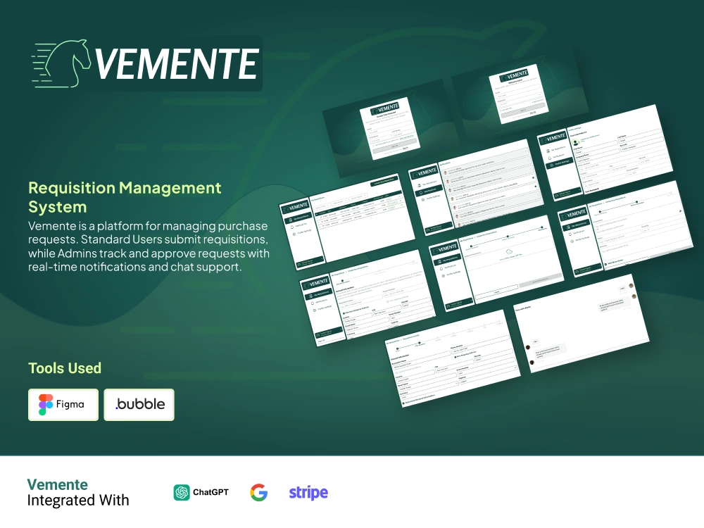 VEMENTE is a Bubble.io-built requisition app where users submit purchase requests and admins manage approvals with real-time updates for a transparent workflow.
