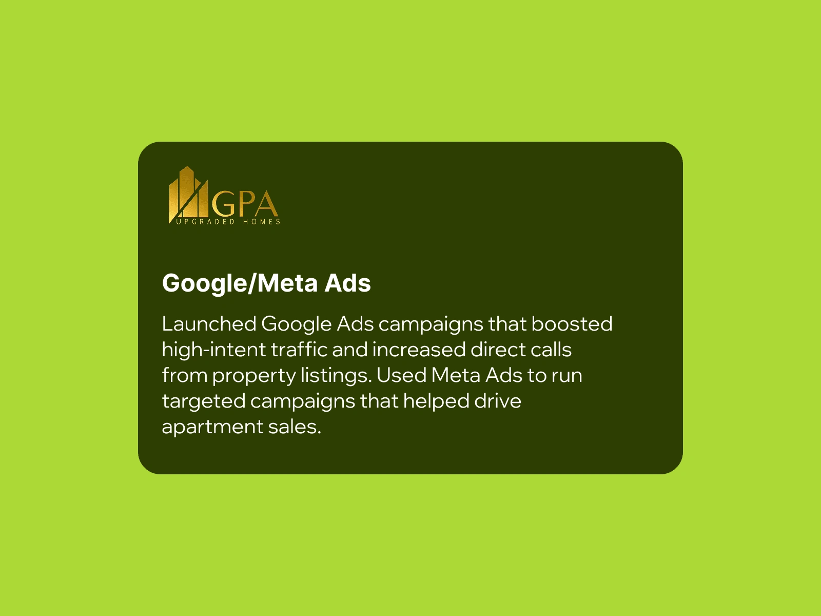 Launched Google Ads campaigns that increased high-intent traffic and direct calls from listings. Meta Ads drove apartment sales with precise targeting.
