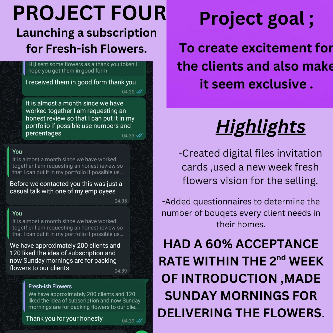 HAD A 60% ACCEPTANCE RATE WITHIN THE 2nd WEEK OF INTRODUCTION ,MADE SUNDAY MORNINGS FOR DELIVERING THE FLOWERS.