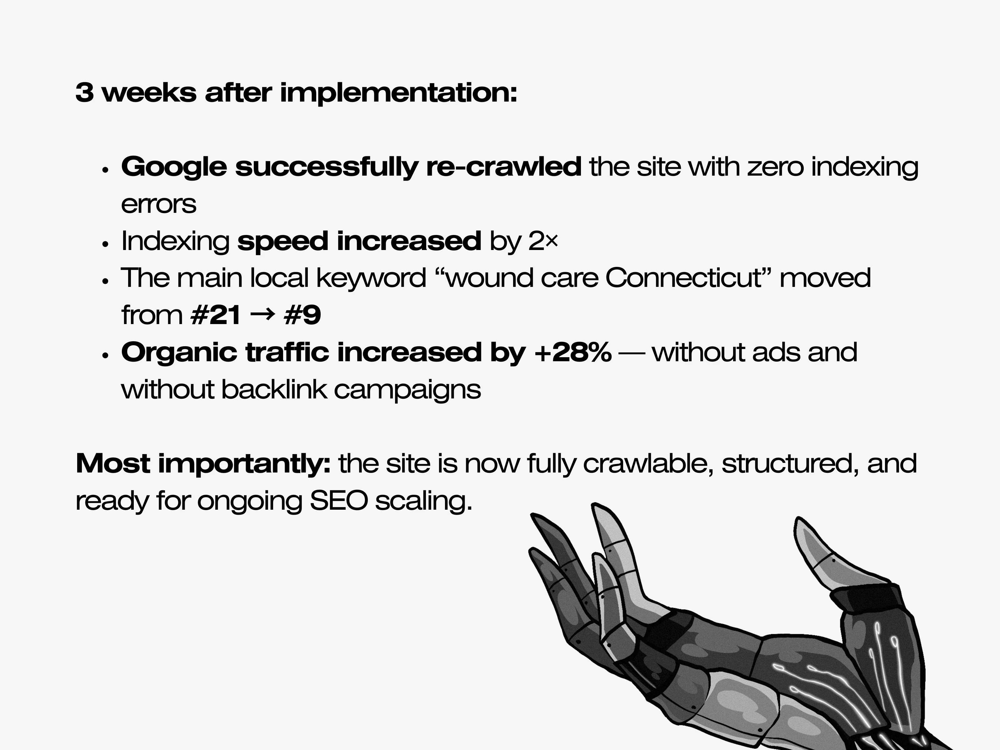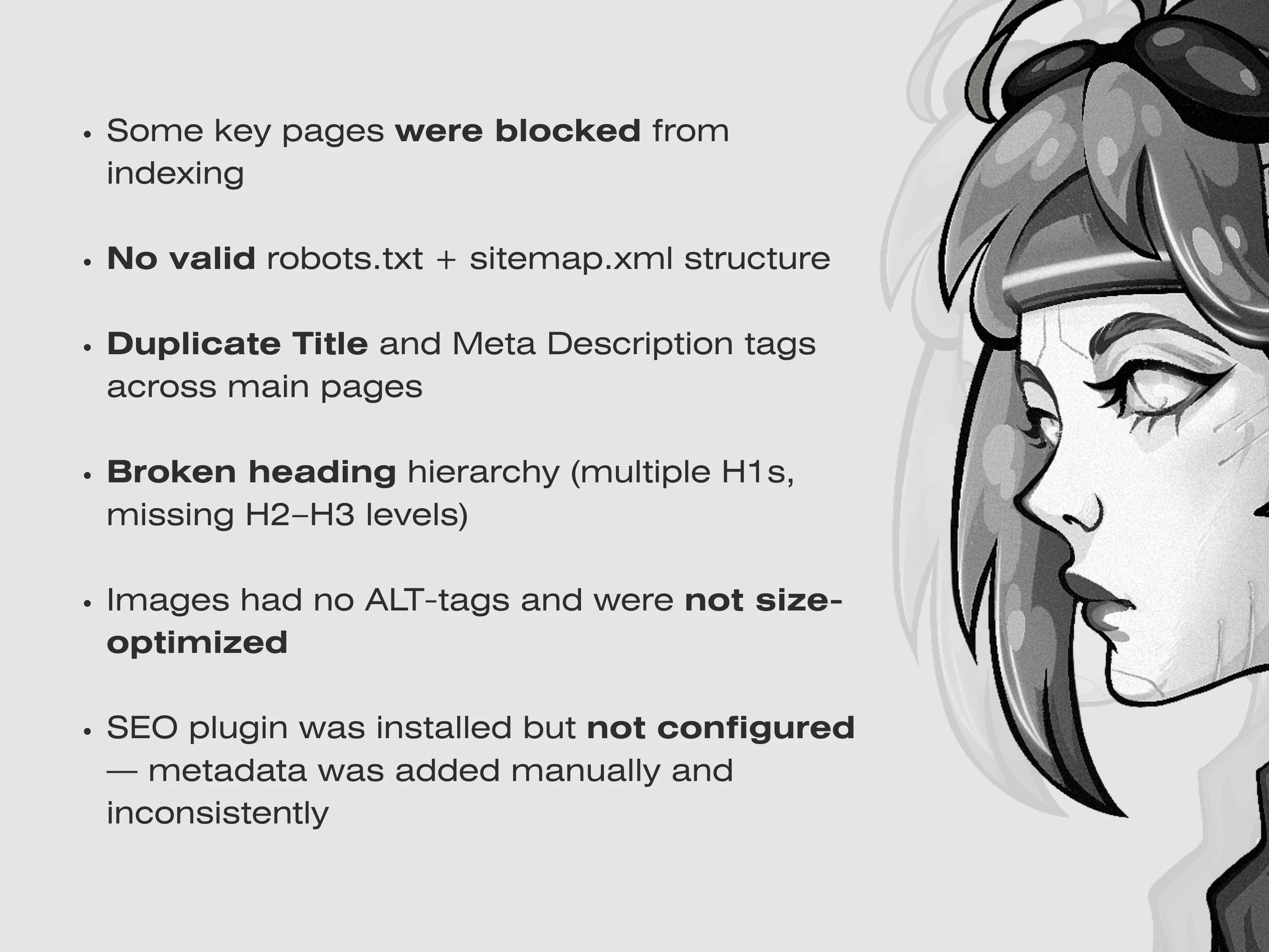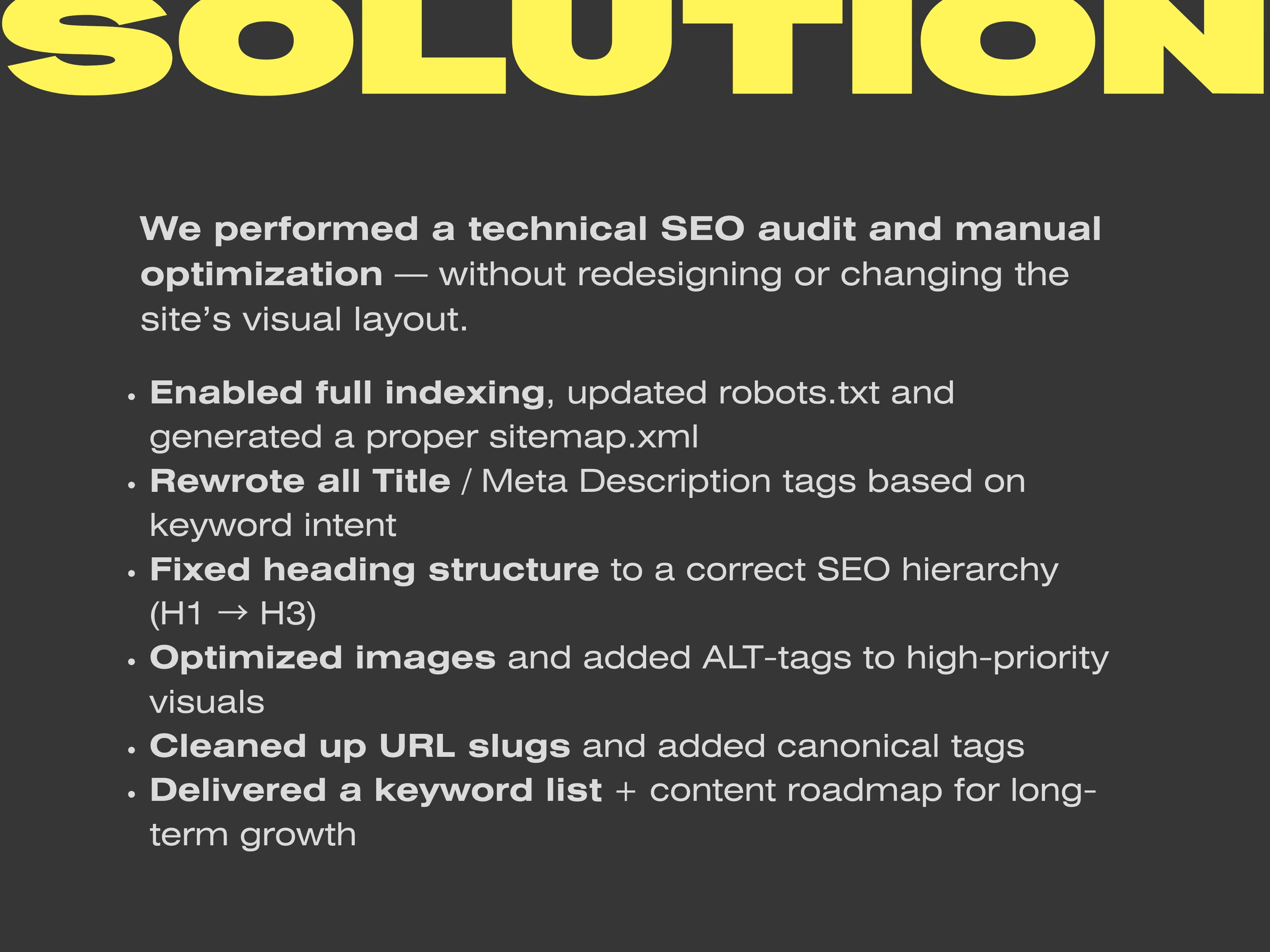 Fixed technical SEO issues, improved site structure, cleaned WordPress setup, and optimized on-page SEO for scalability.