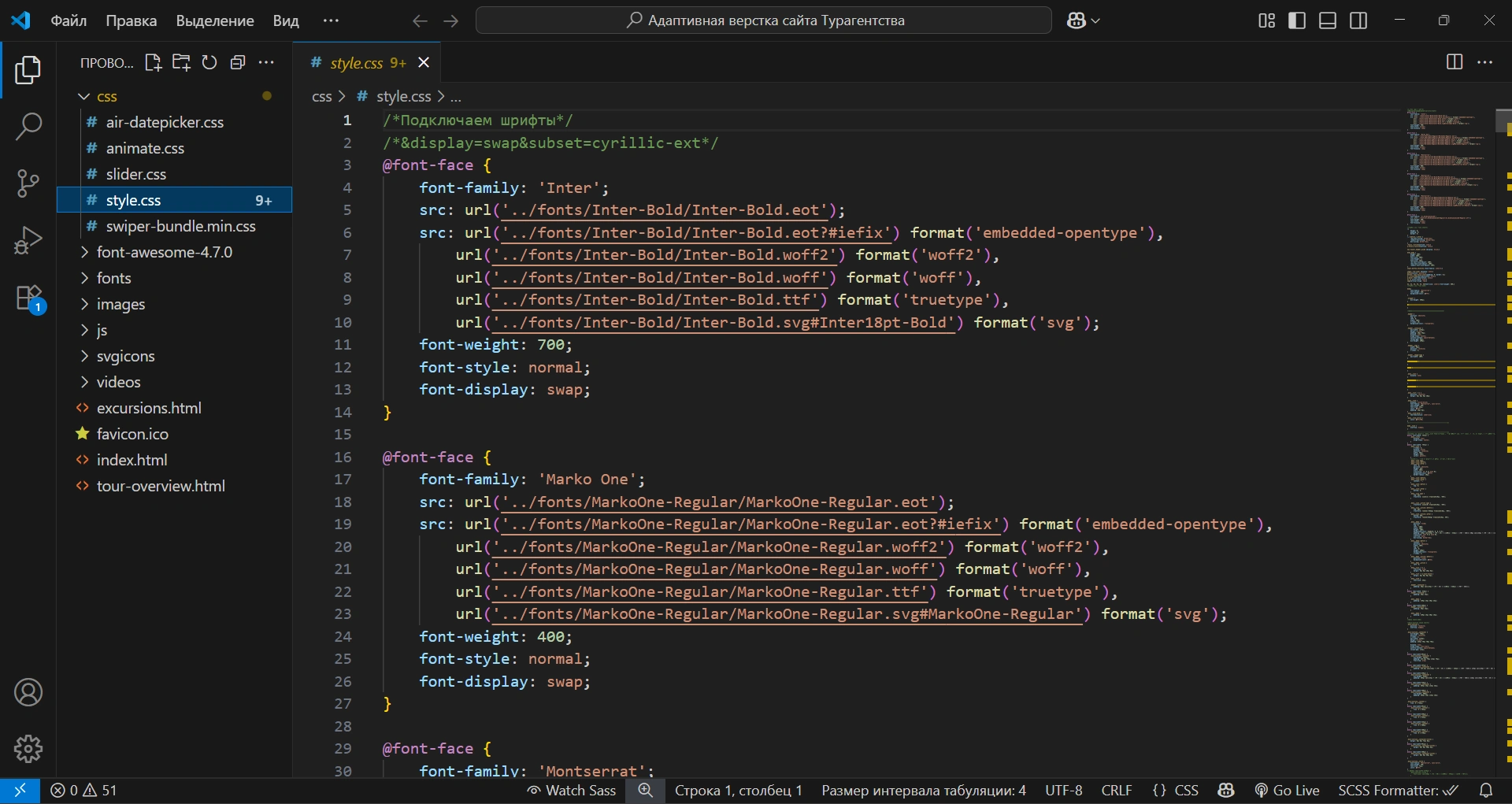 The work is done on HTML, CSS, JS using the BEM methodology. When working on the project, I used Flexbox and Grid. I made the icons in this project using SVG sprites. I also made several sliders, a custom date input field with a calendar, custom checkboxes and radio buttons, sliders for selecting a range of prices for excursions, tabs and several spoilers. On the excursion overview page, I made a travel calendar on JS. I made it adaptive up to 320 pixels of the browser window width.