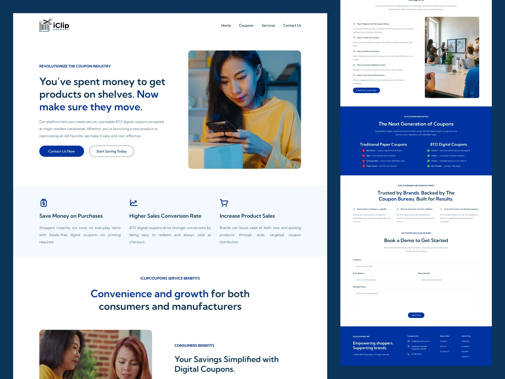 Designed a modern landing page for iClipCoupons to promote secure digital coupons to both consumers and manufacturers.