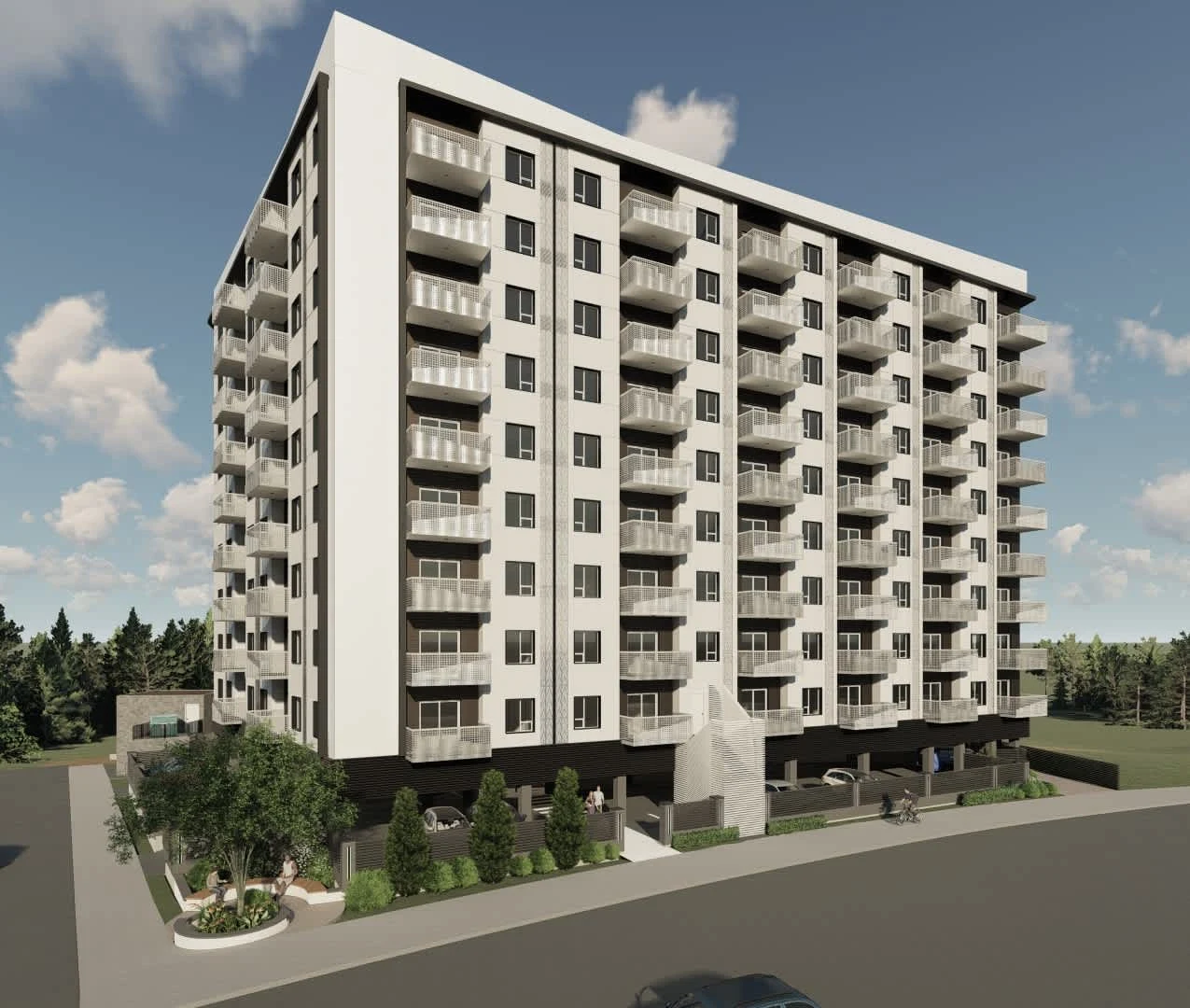 A 10-story residential building featuring a design that combines white and gray metal panels with perforated accents, creating a sleek, modern urban presence.