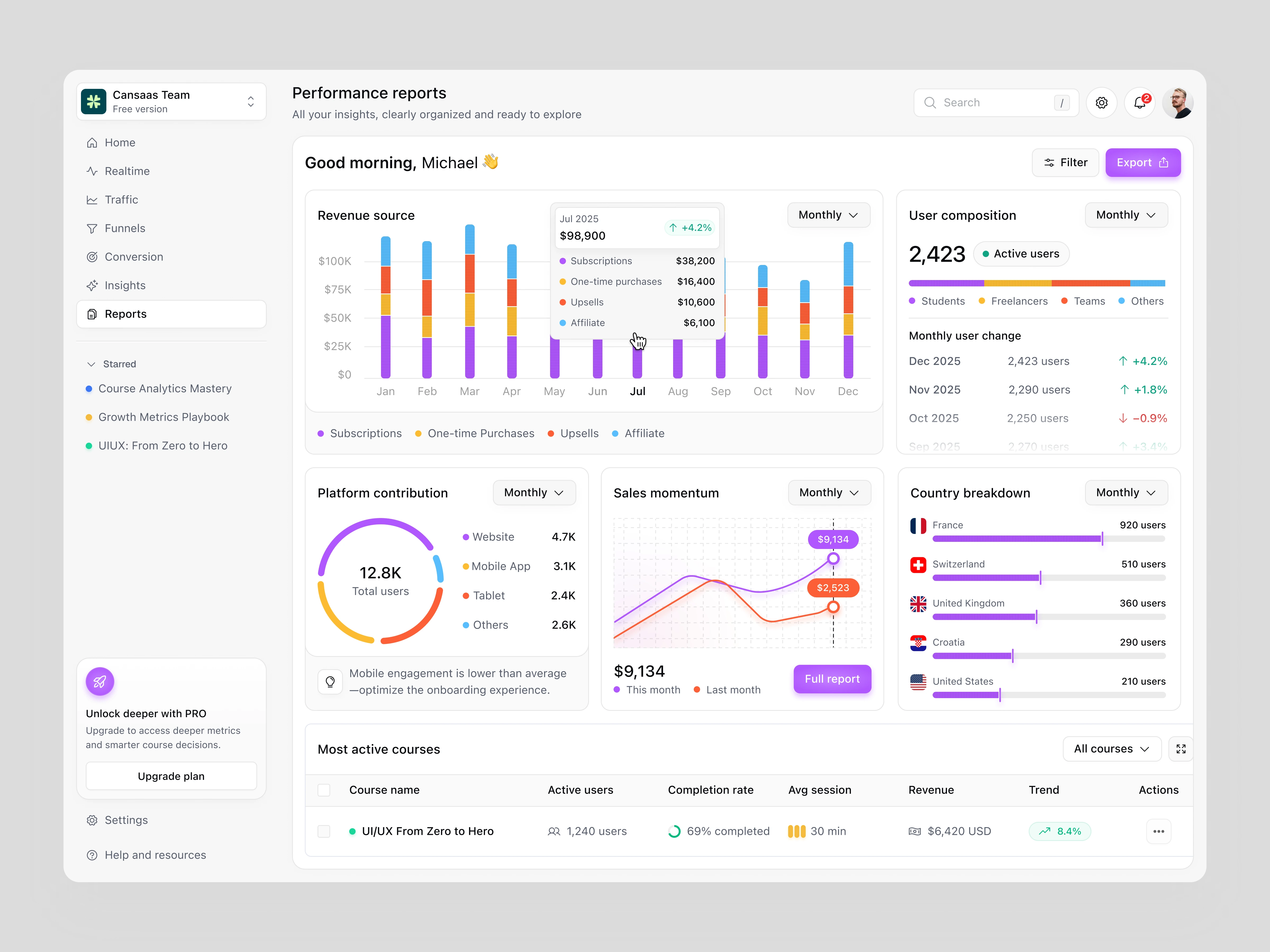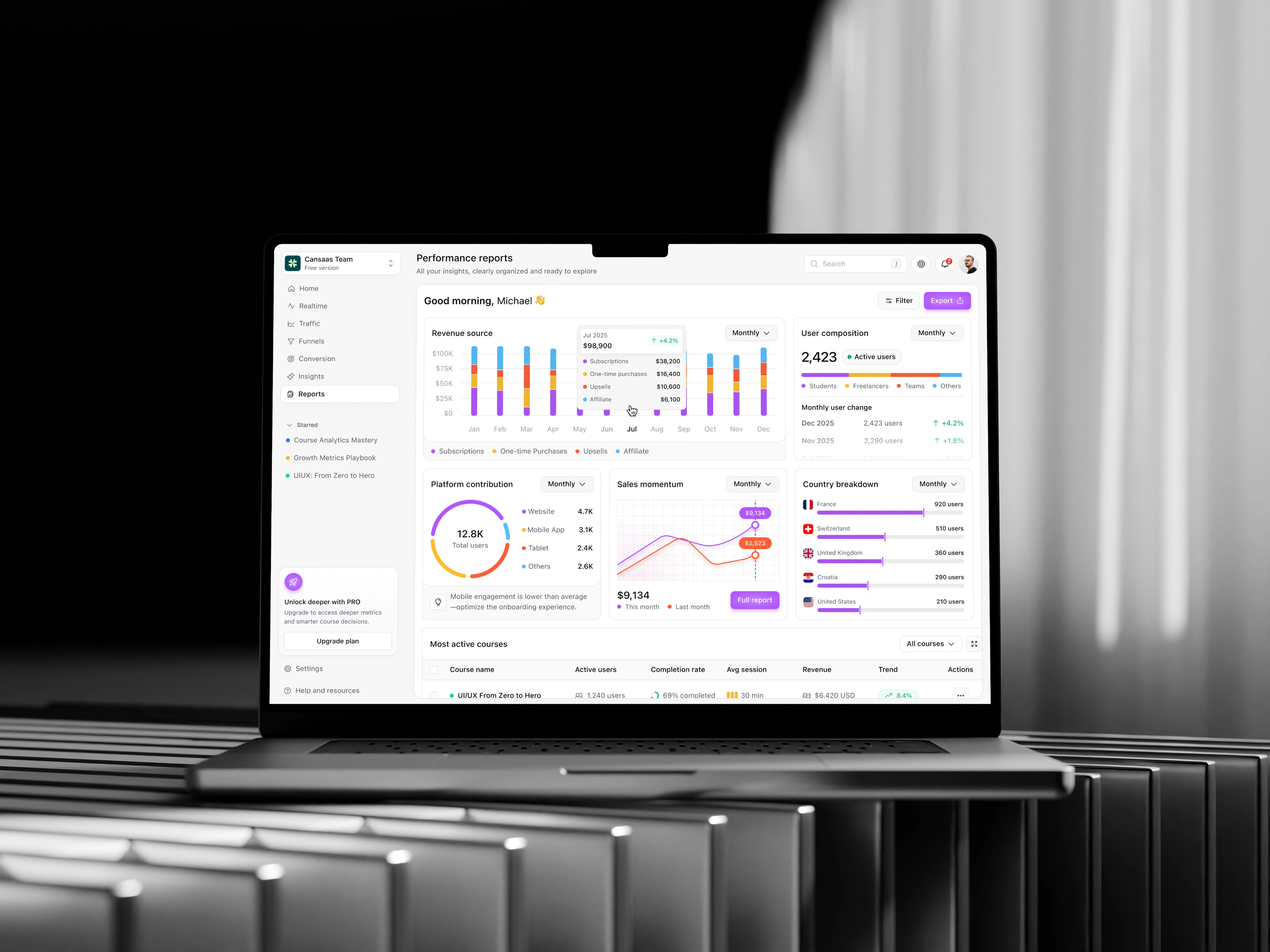 Analytics dashboards often overload users with charts and numbers, making it difficult to identify what actually matters. The challenge was to present multiple metrics revenue, growth, user distribution, and engagement without overwhelming the interface or the user.