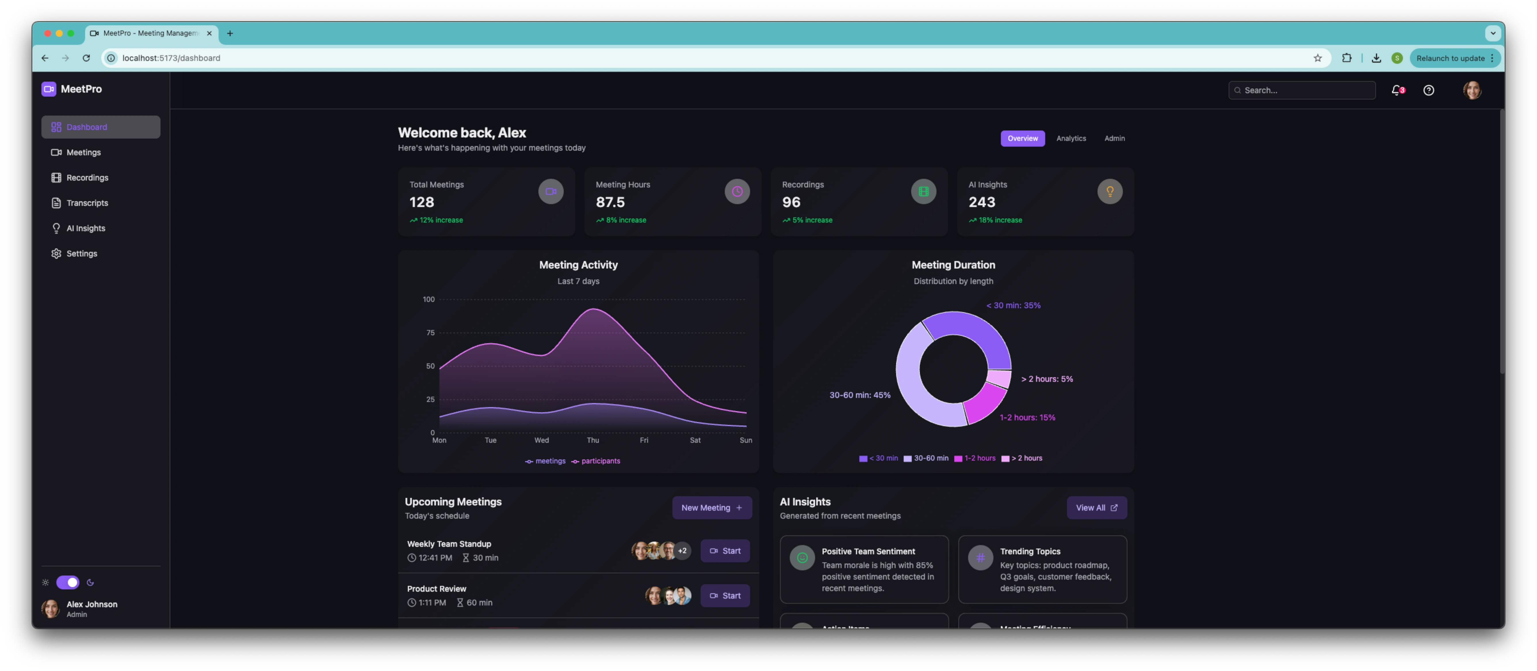 MeetPro is a comprehensive meeting management dashboard built with React, TypeScript, and Bolt.new. It provides a centralized platform for managing virtual and in-person meetings with AI-powered insights.