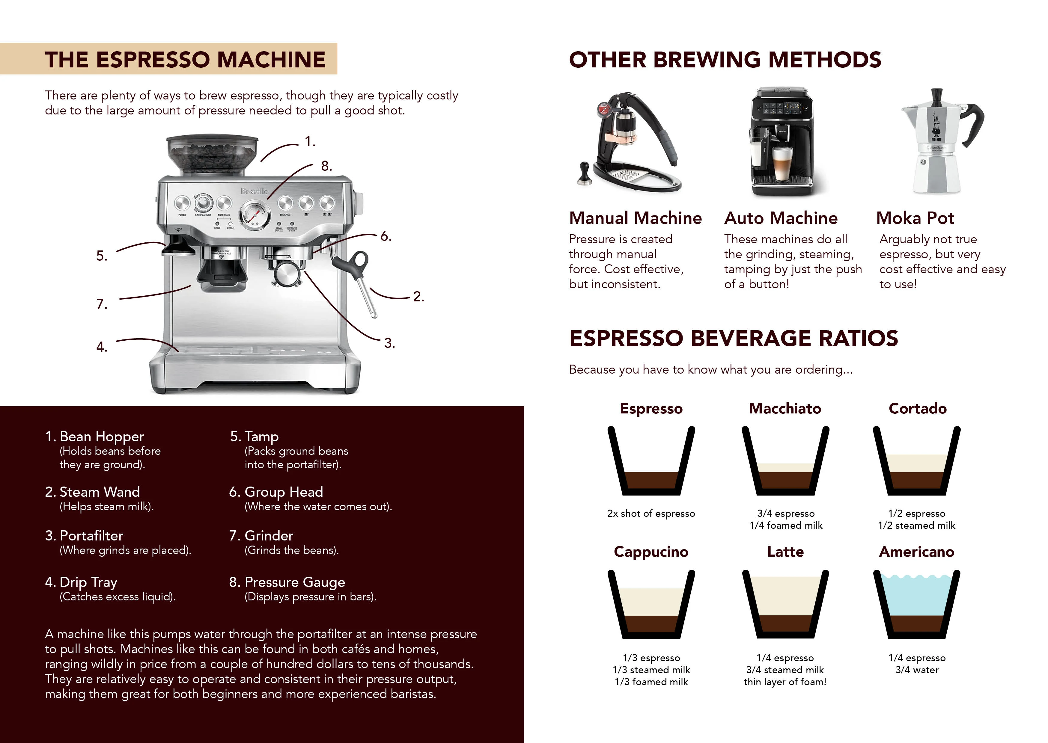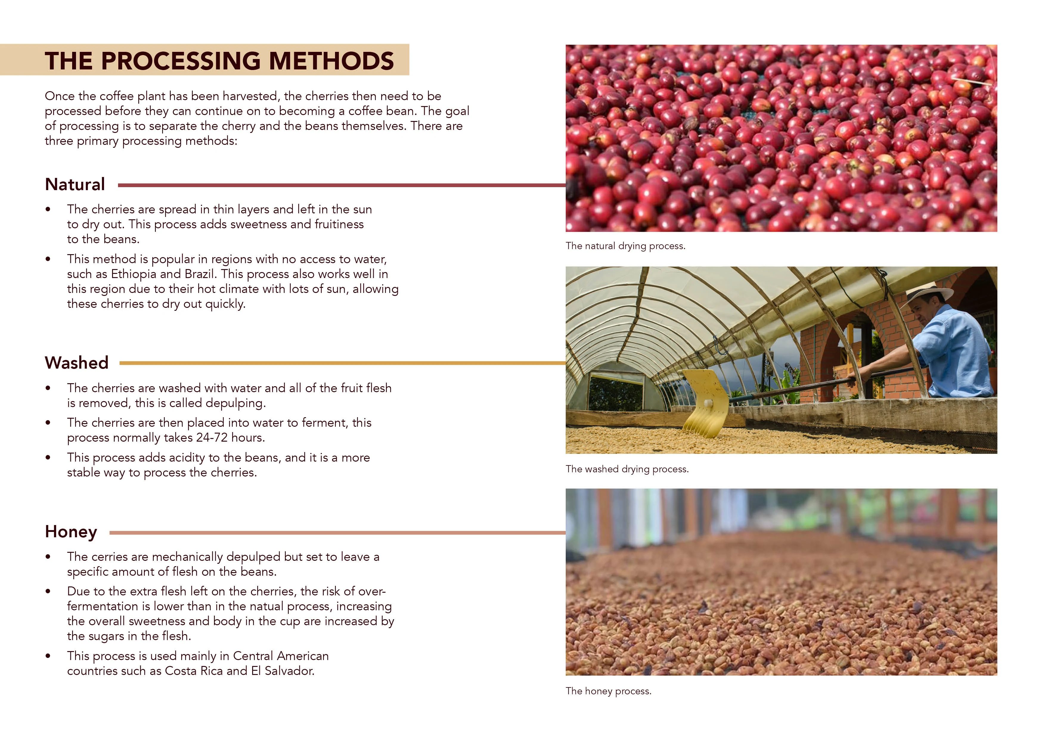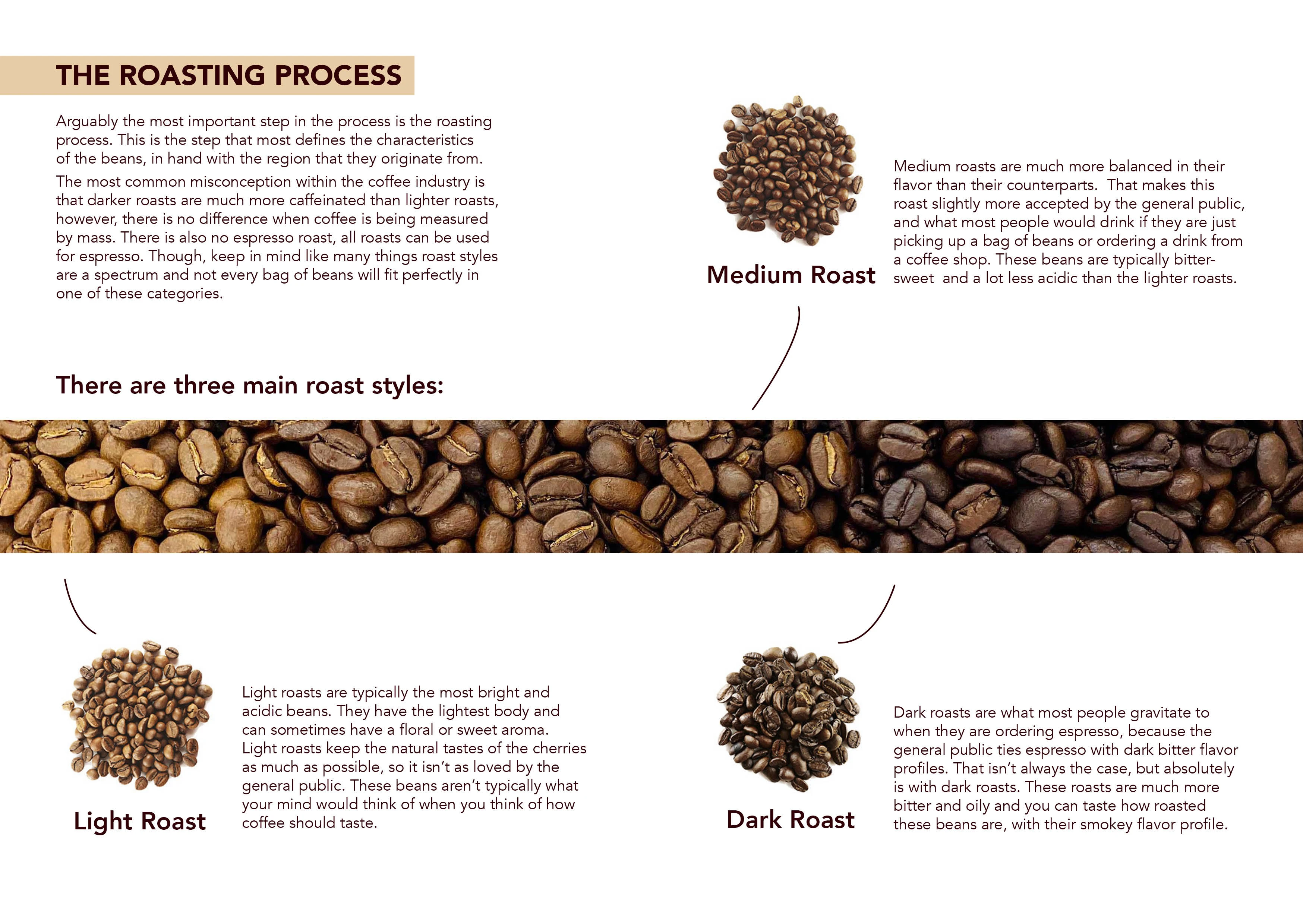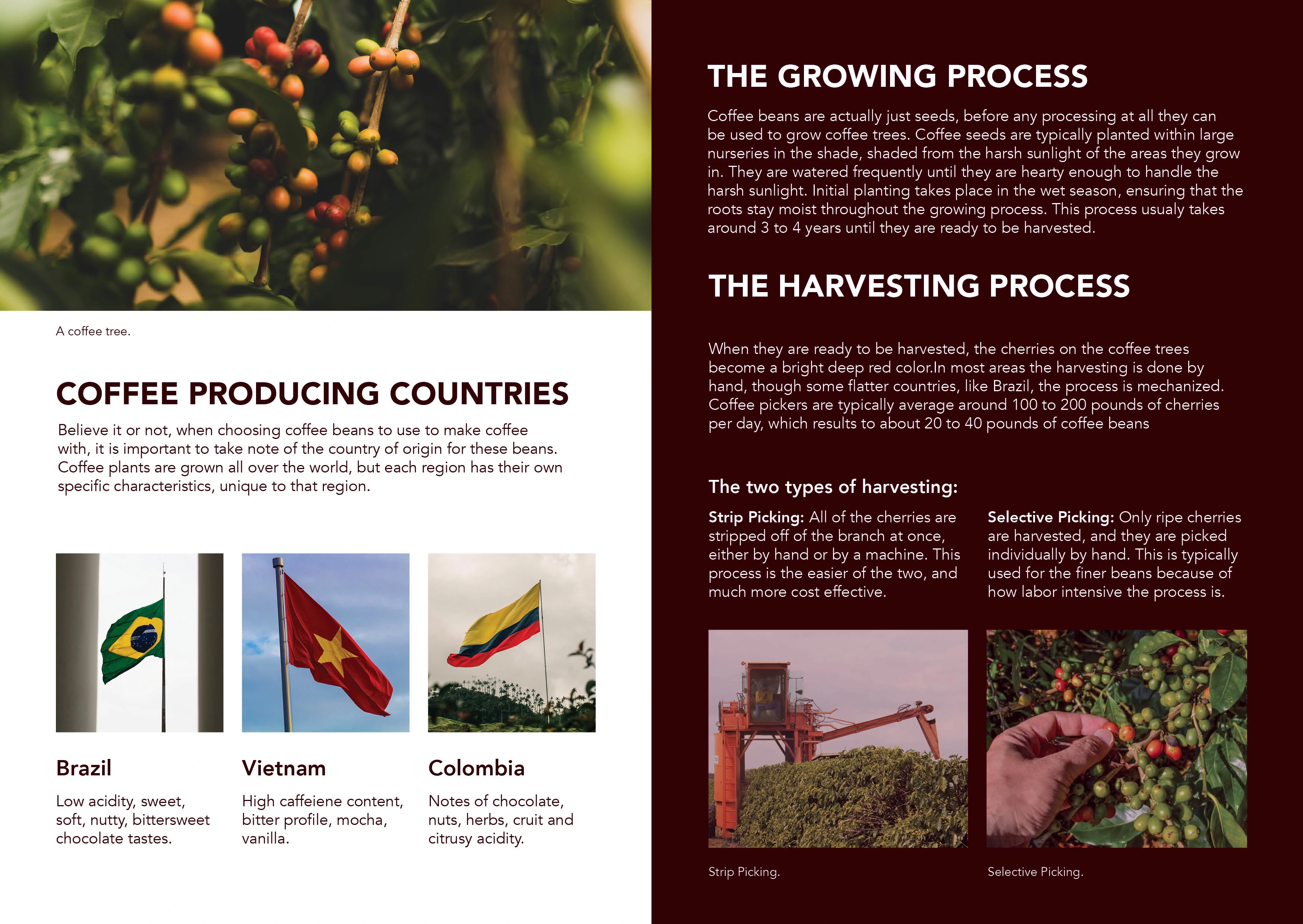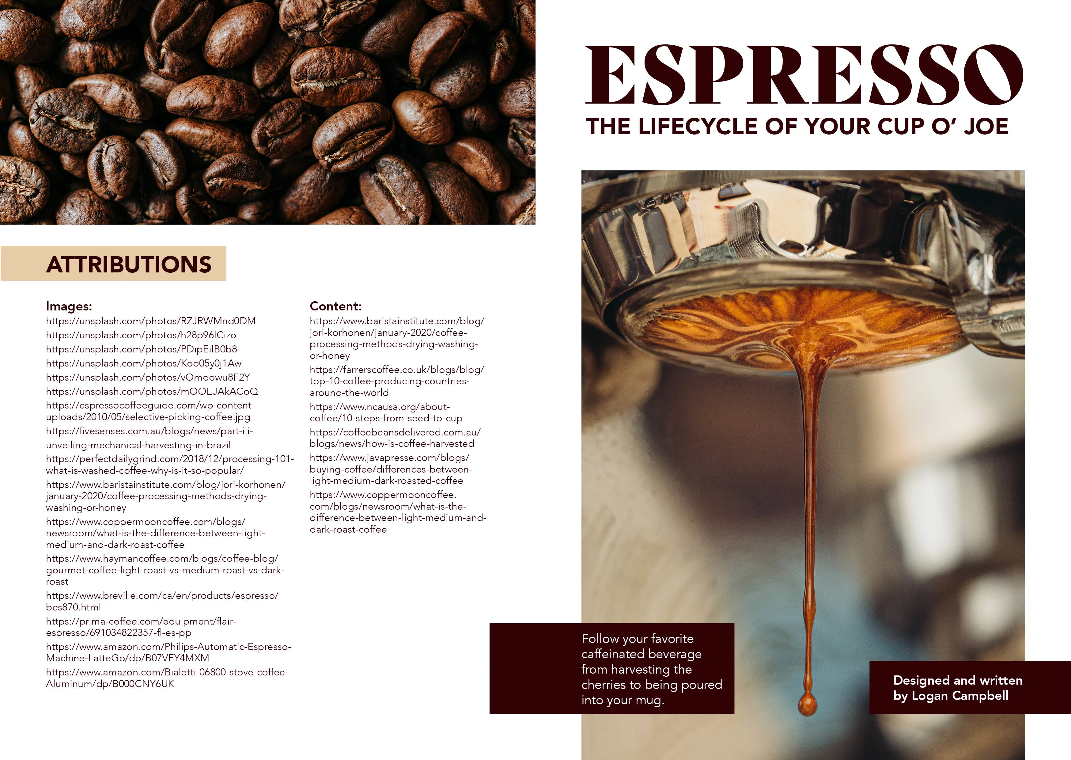 Booklet showcasing the process from harvesting coffee beans to pulling a shot of espresso. Could be showcased in a coffee shop.