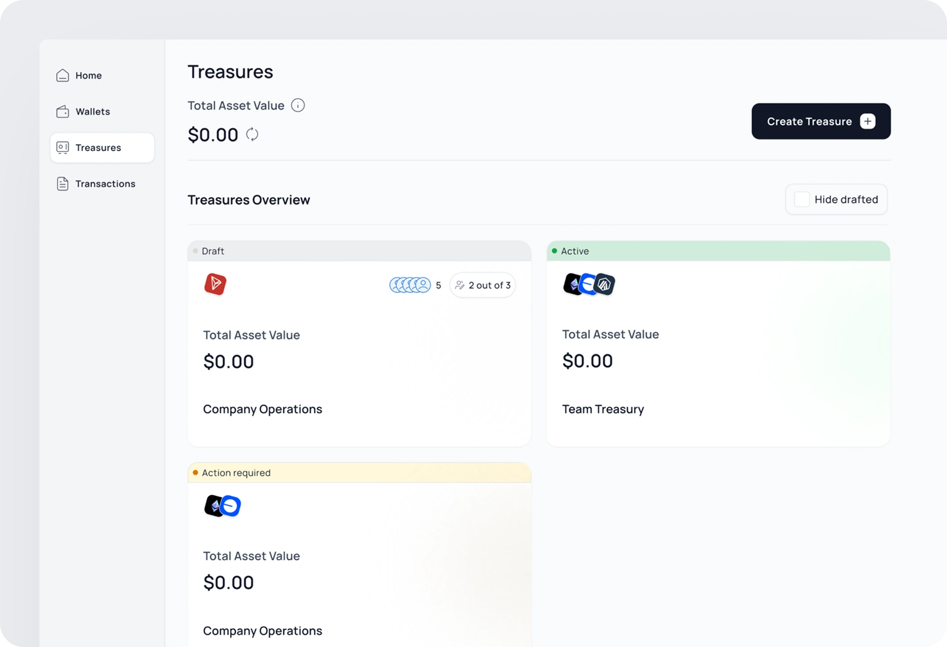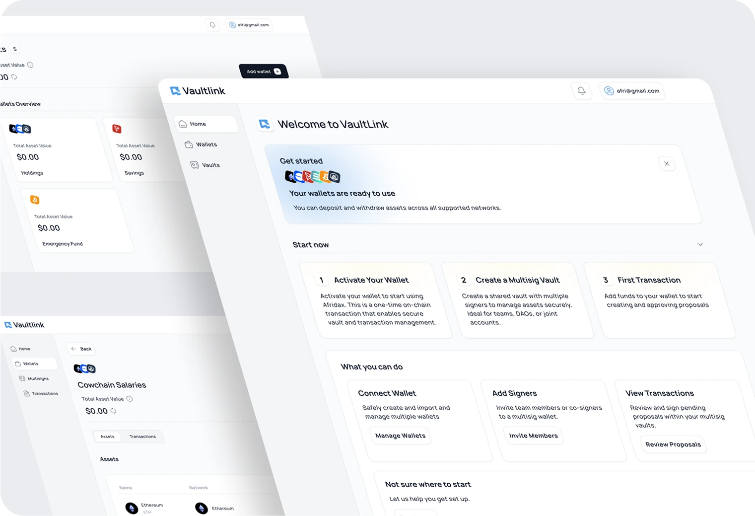 The UI was built using modular components that supported both personal wallets and shared multisig treasuries, with clearly defined roles and actions. I applied progressive disclosure principles and embedded contextual tips to help guide non-technical users through blockchain-specific actions without overwhelming them. Throughout the process, I worked closely with developers to ensure the UI accurately reflected the logic and state of underlying smart contracts, especially during multi-party signing and approval flows.