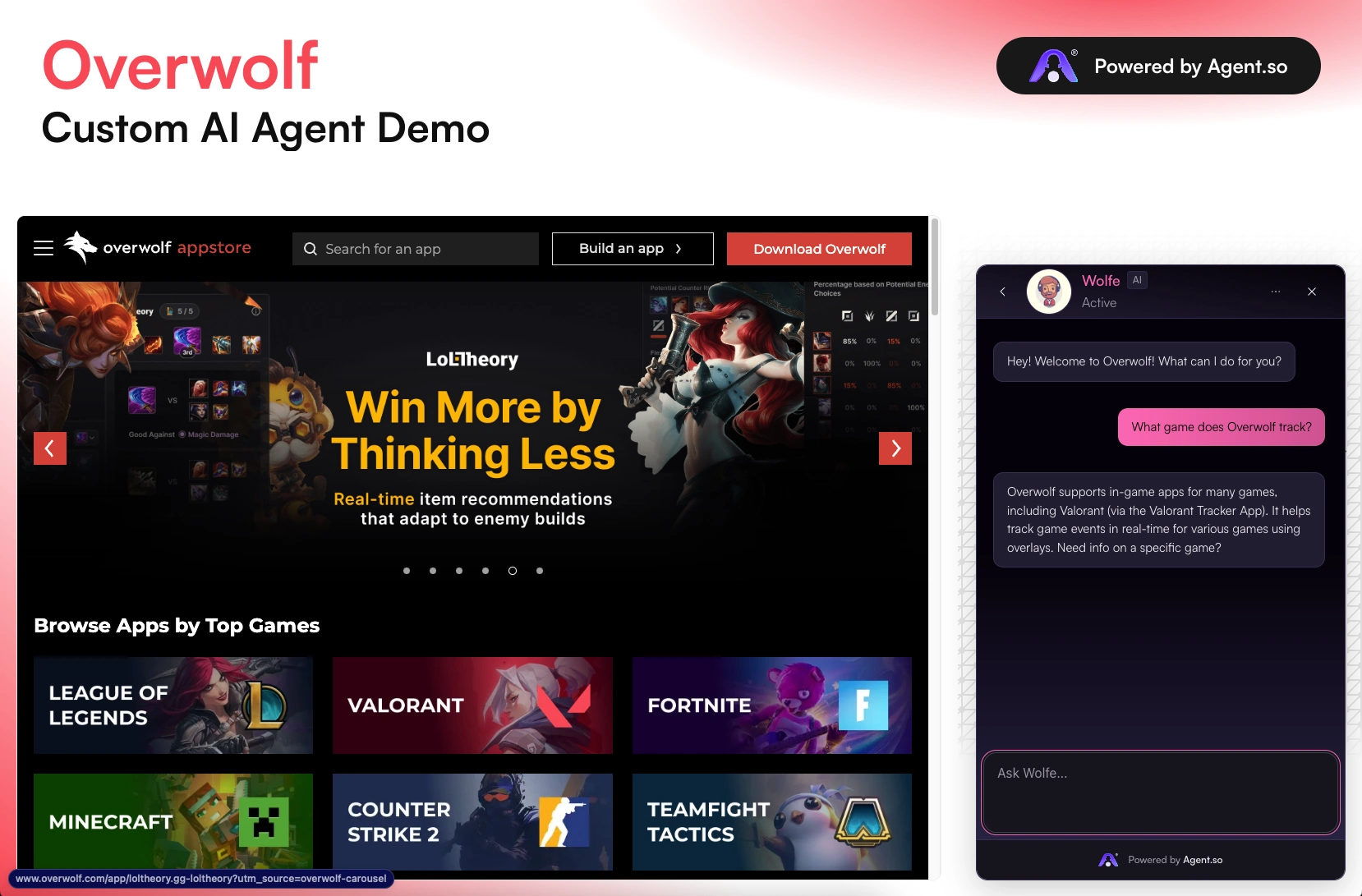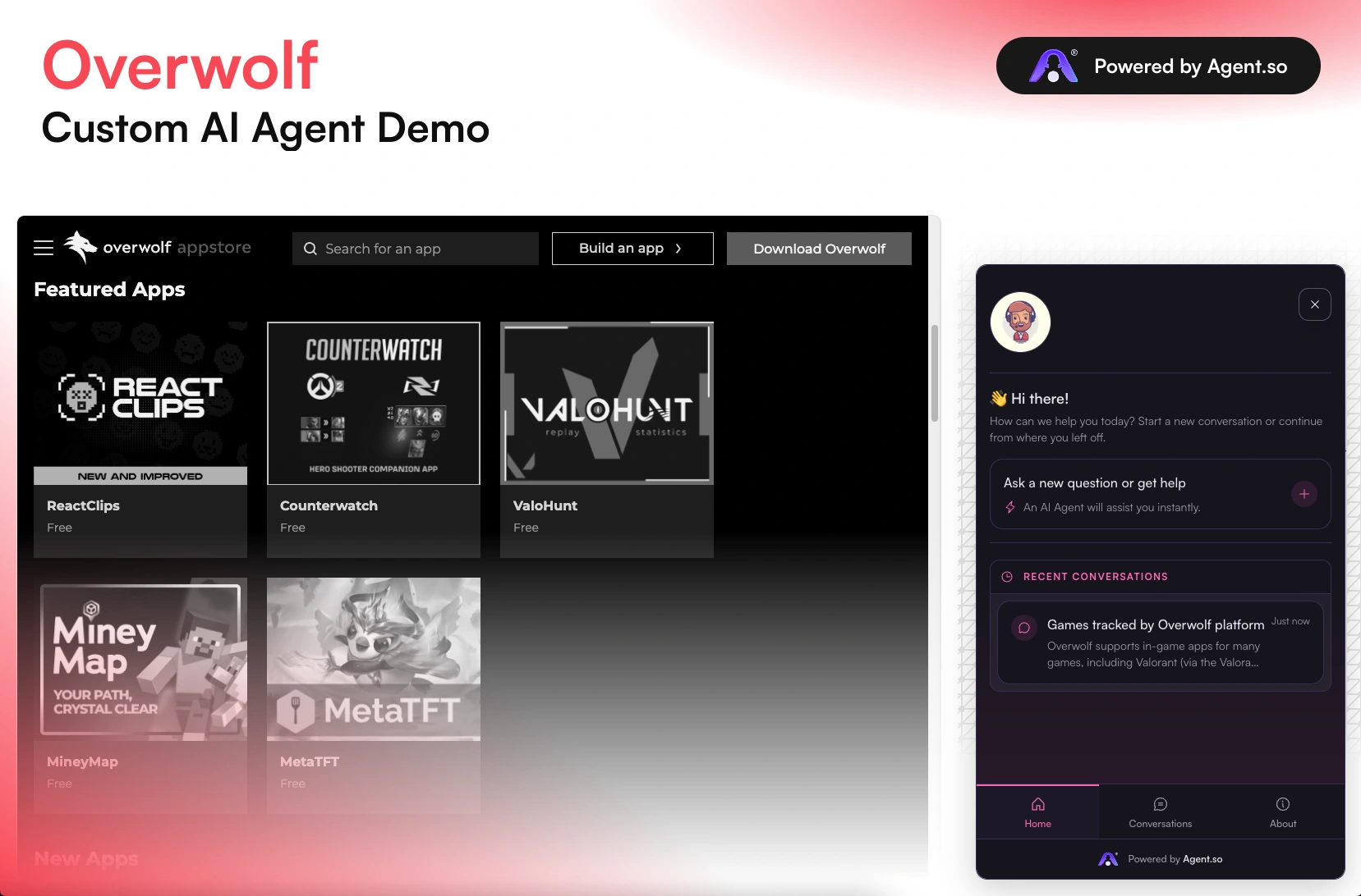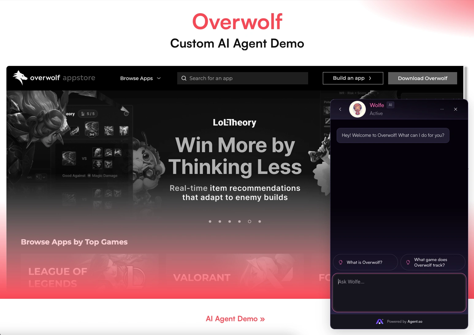 A custom AI Agent trained on knowledge about Overwolf, designed to serve visitors who go to the site & want to learn more about the brand, engage with, etc.