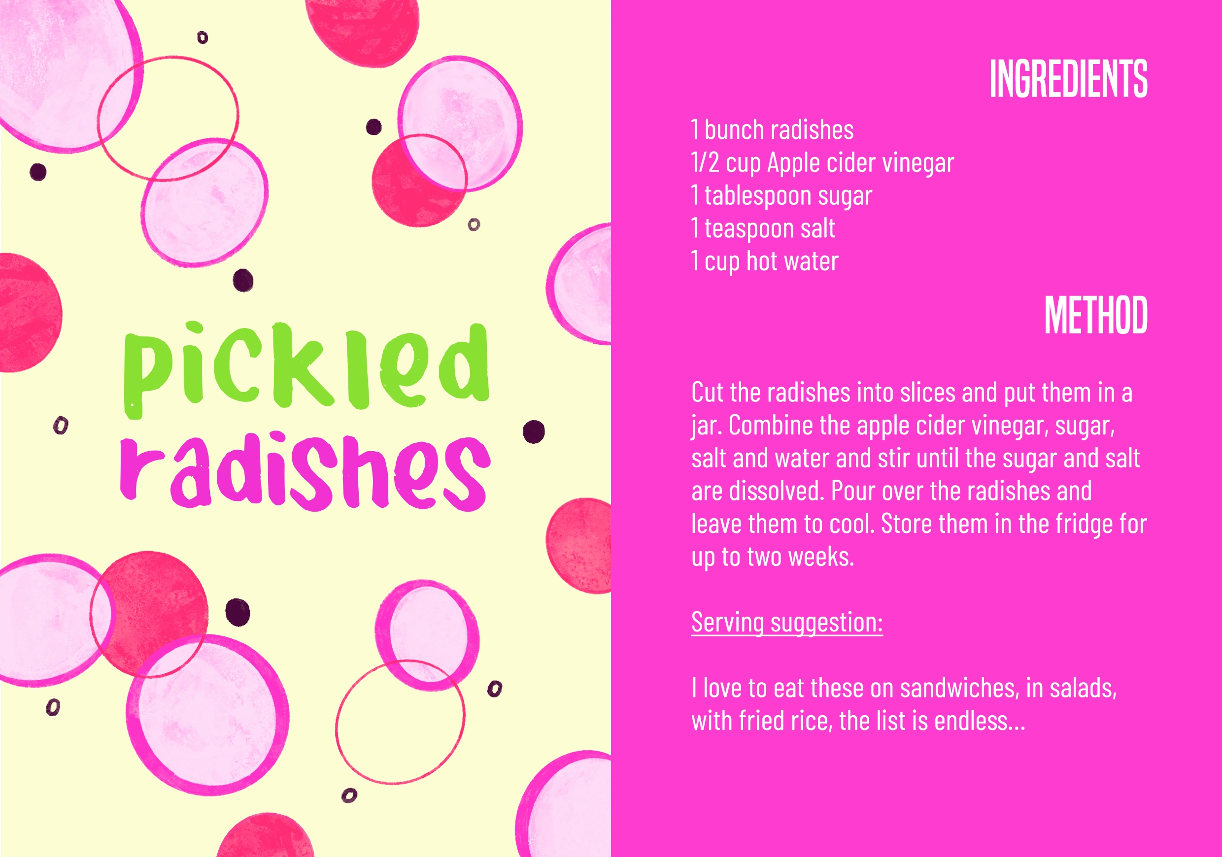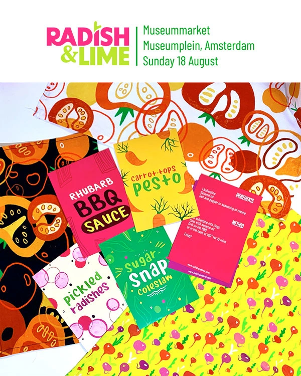 The seasonal and zero-waste recipes (all my own recipes) were all inspired by seasonal vegetable harvests, which also inspired the other print and packing designs for Radish&Lime. The cards were sold as physical products at creative markets and also sold online as a downloadable PDF on the radishandlime website.