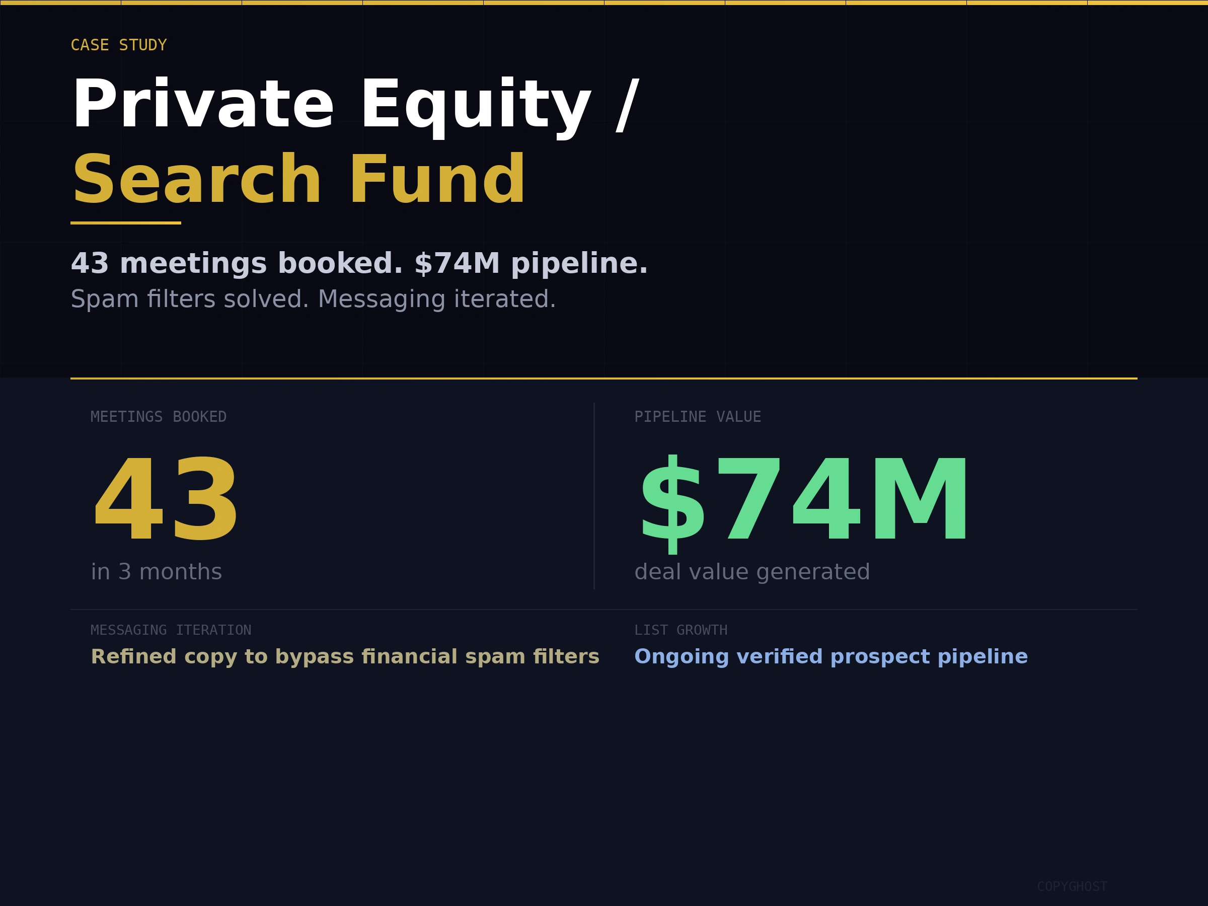 Booked 43 meetings in 3 months, adding $74M in pipeline value. Rebuilt email infrastructure and iterated messaging to bypass financial spam filters.
