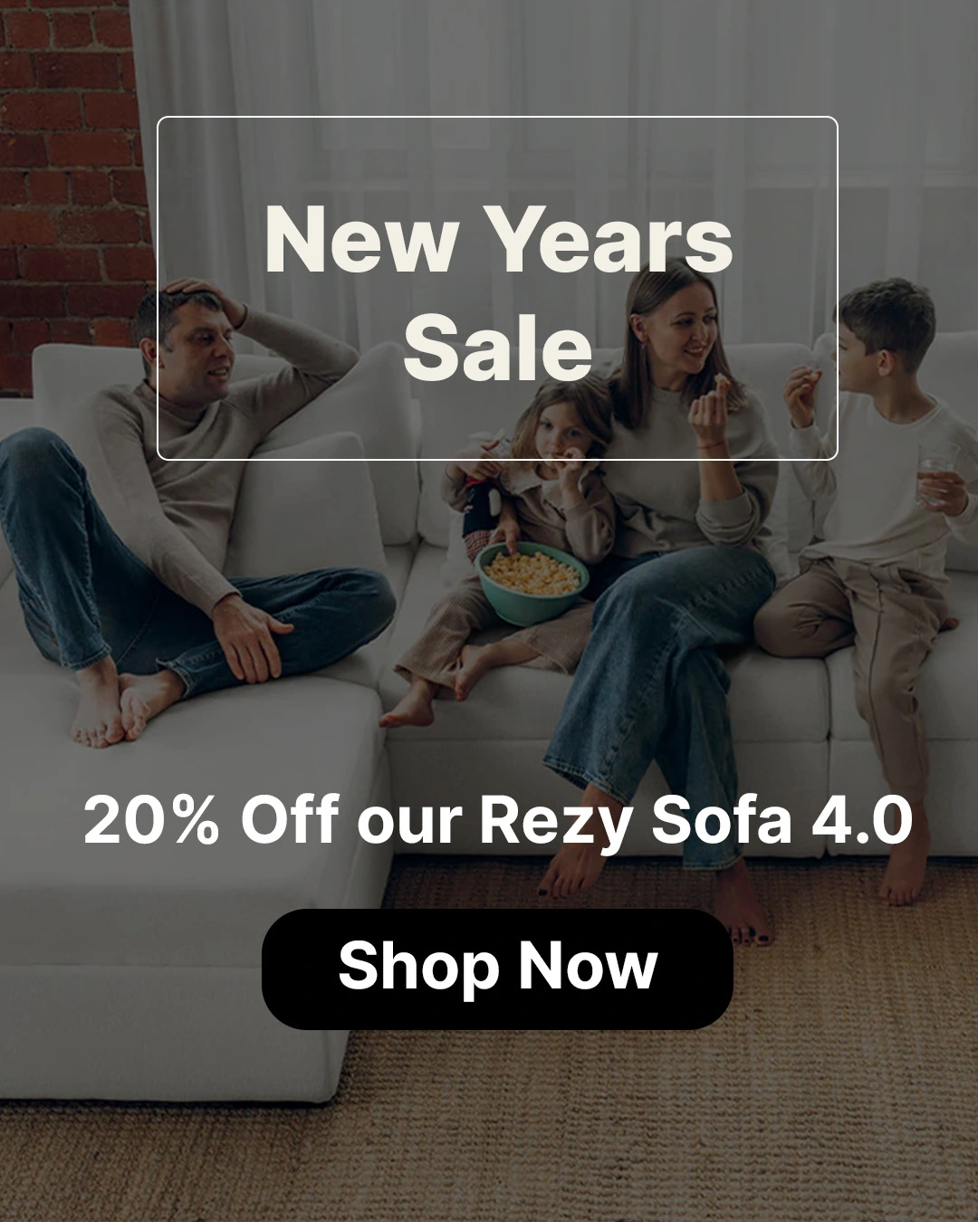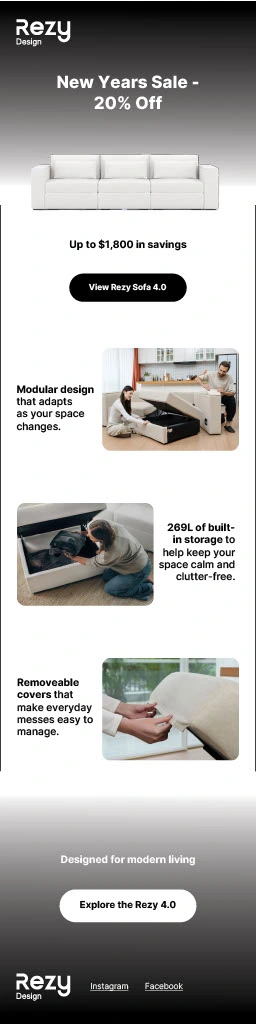 The brief required designing a mobile-first email section promoting a New Year's Sale (20% off the Rezy 4.0 Sofa) while maintaining a clean, premium aesthetic. The design emphasizes visual hierarchy, guiding the viewer from the promotional offer to key product features and a clear call to action.