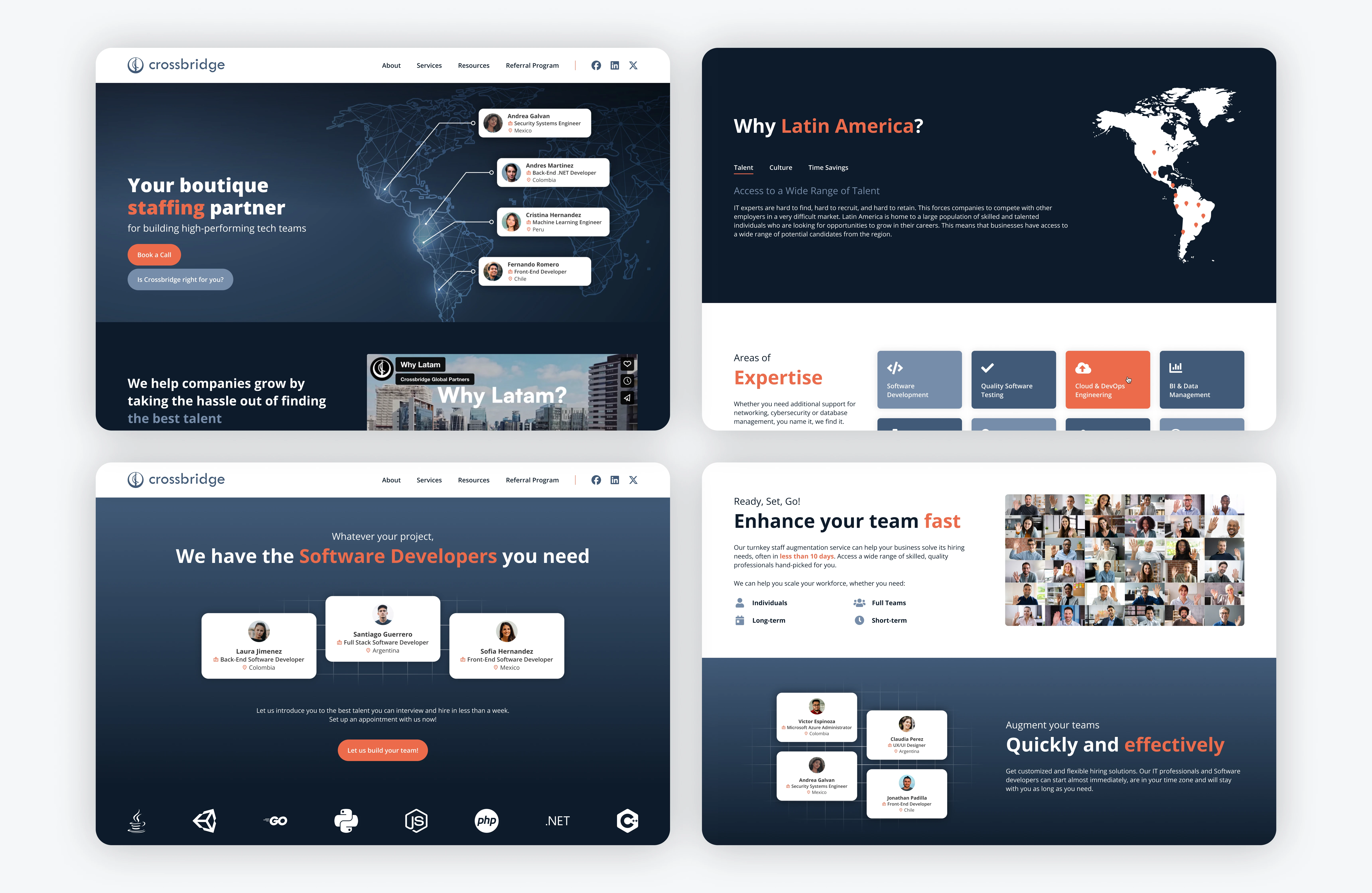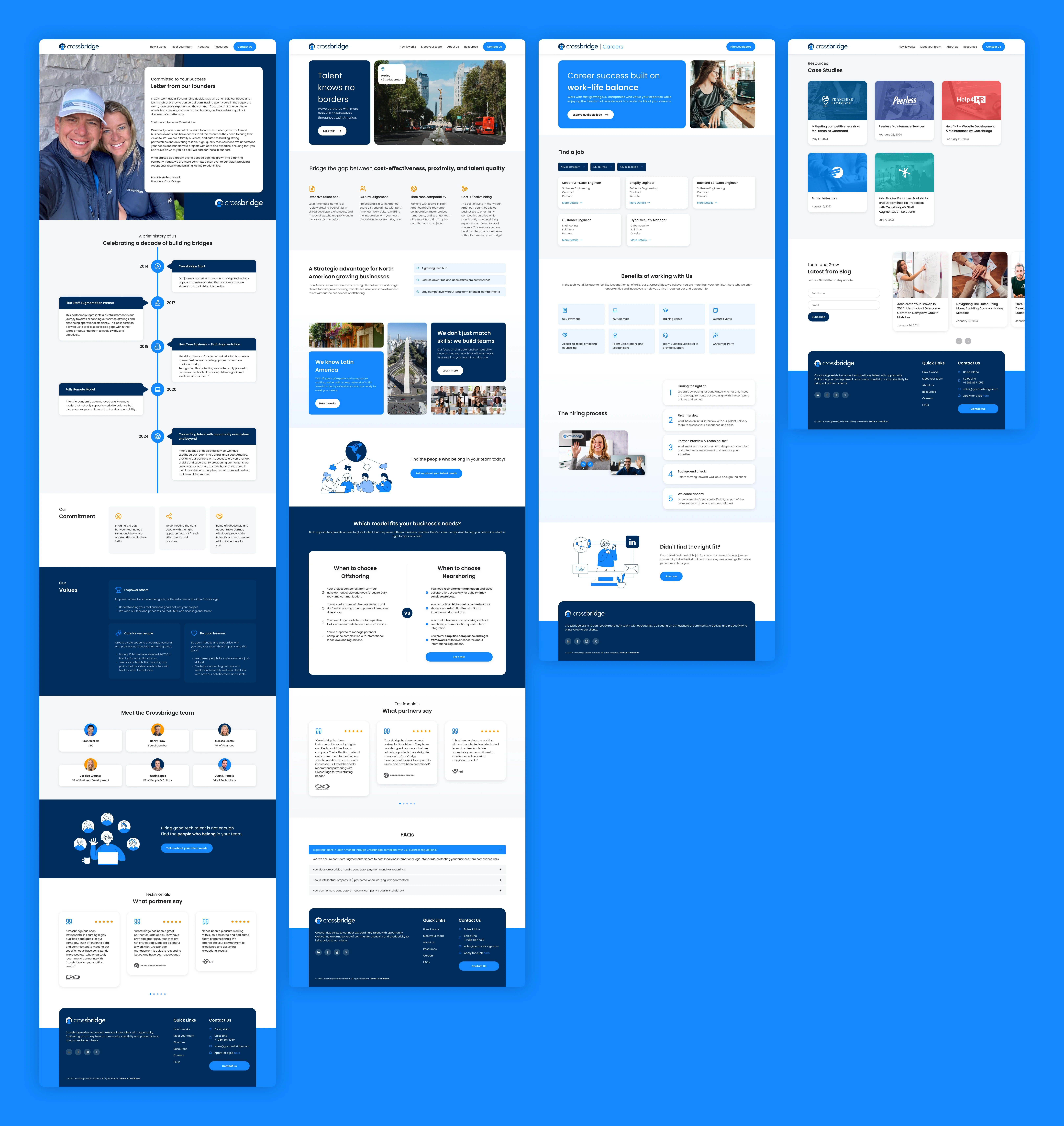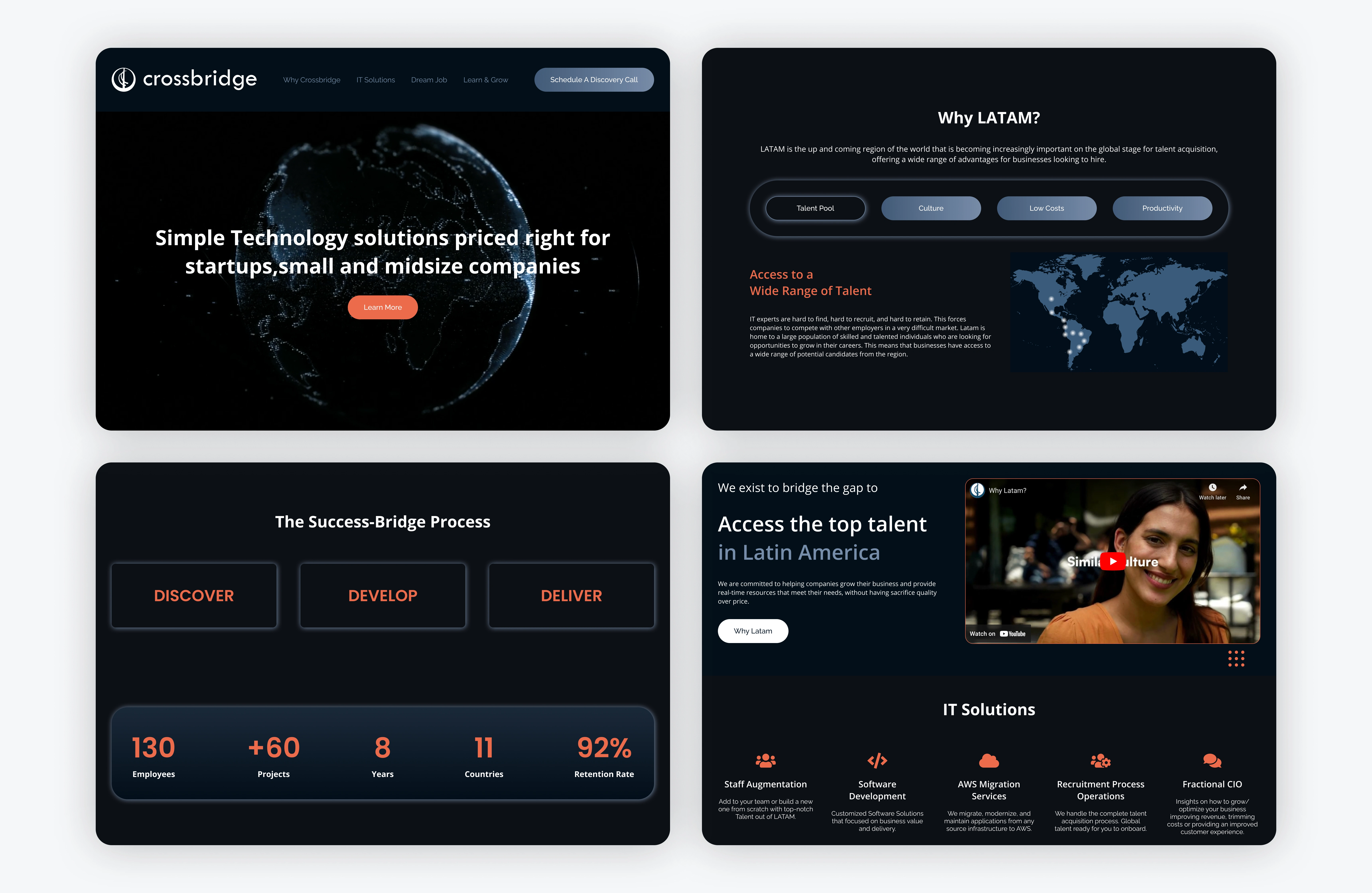 Before the latest redesign, Crossbridge’s website underwent two earlier versions. The first had a dark and outdated aesthetic, with limited functionality that did not effectively showcase the company’s services or mission. I joined the project during the second version, where my role was to refine the existing design by aligning it with the company’s brand colors, unifying typography, ensuring responsiveness, standardizing margins and paddings, and removing distracting text animations. While these adjustments brought some improvements, the site retained a dark theme and lacked the thorough, user-focused approach implemented in the latest version.