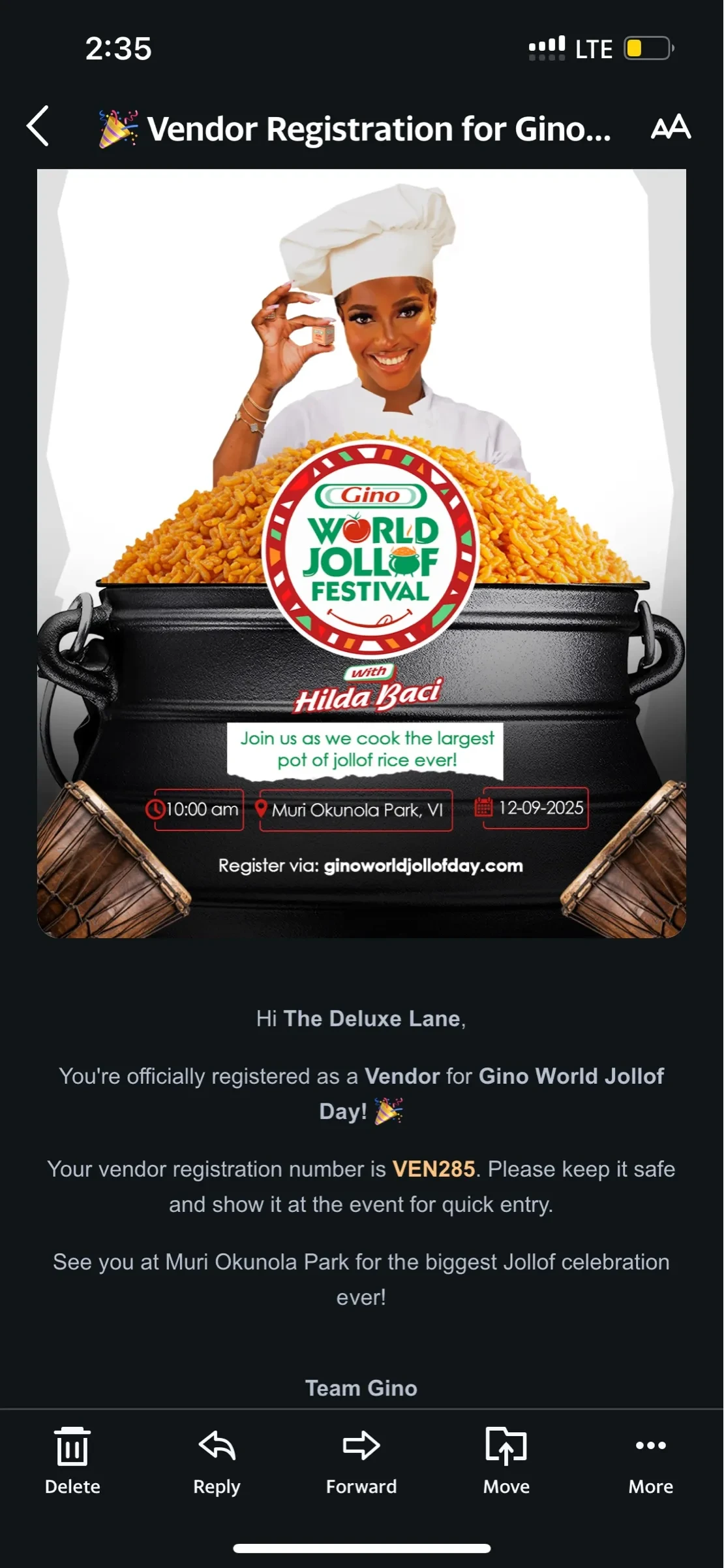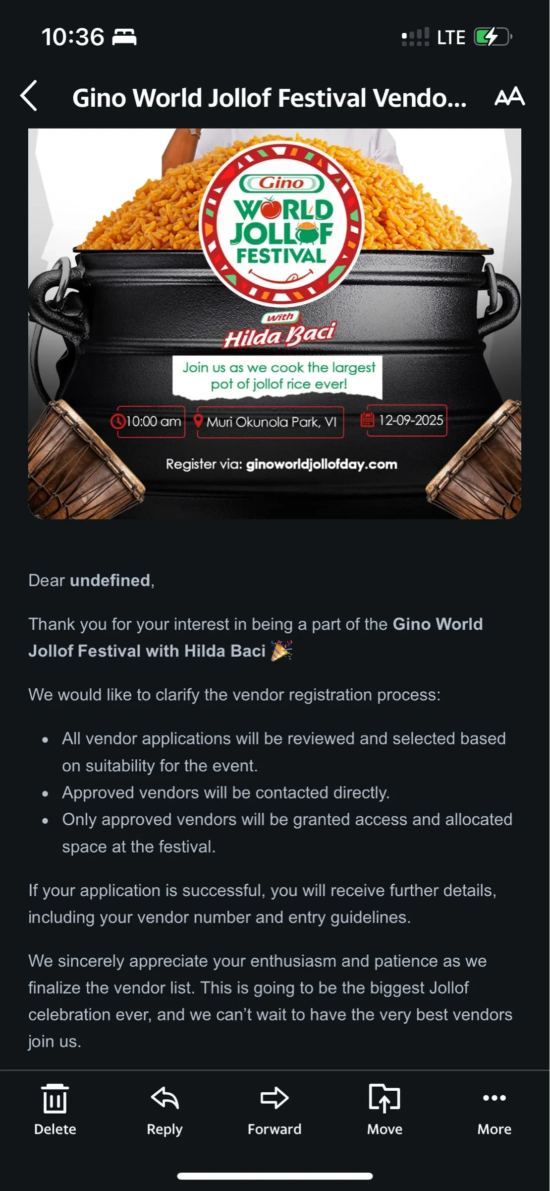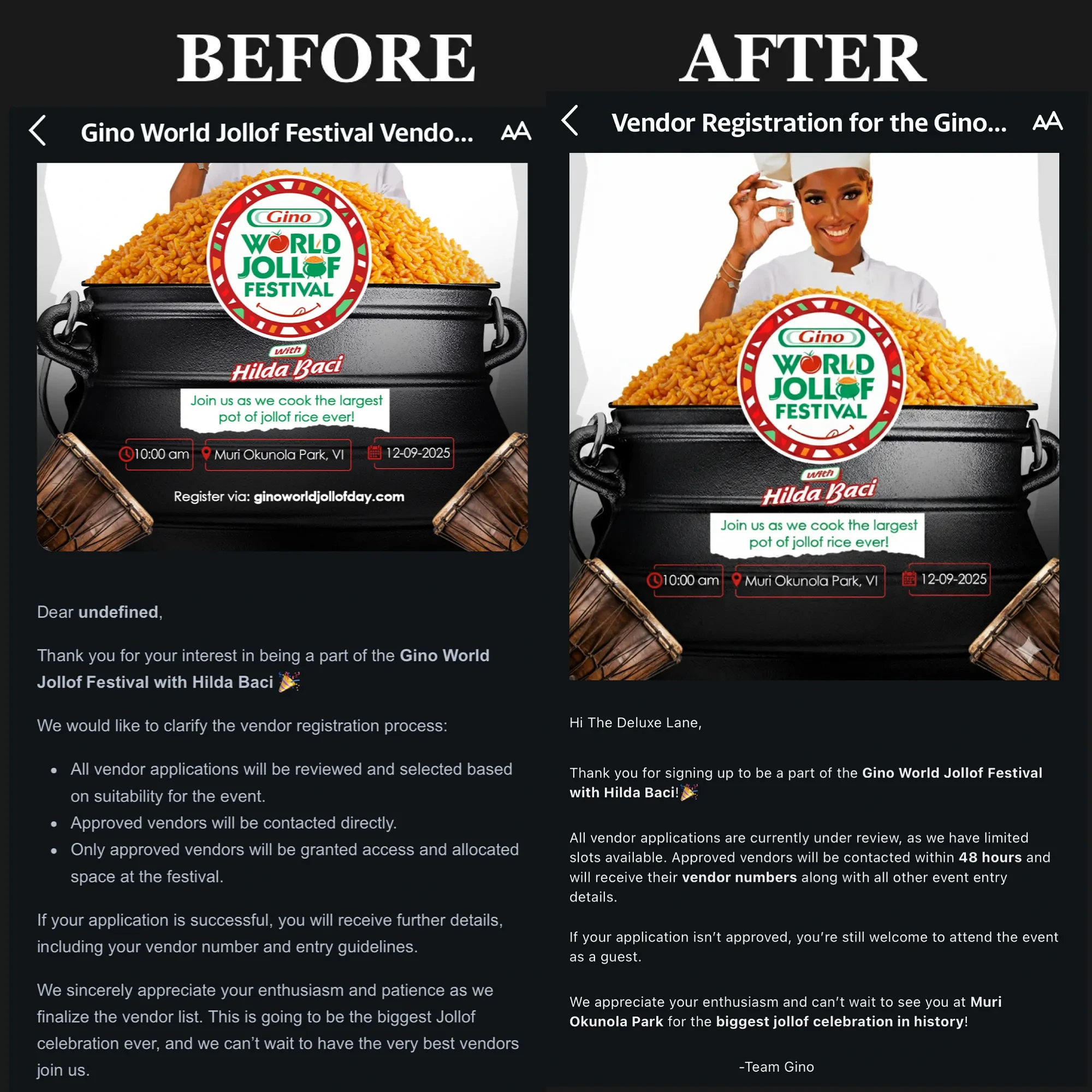 That’s why the vendor emails for the Gino World Jollof Festival stood out to me. They’re a masterclass in how a brand can unintentionally create confusion and doubt, all through a few poor UX writing decisions.