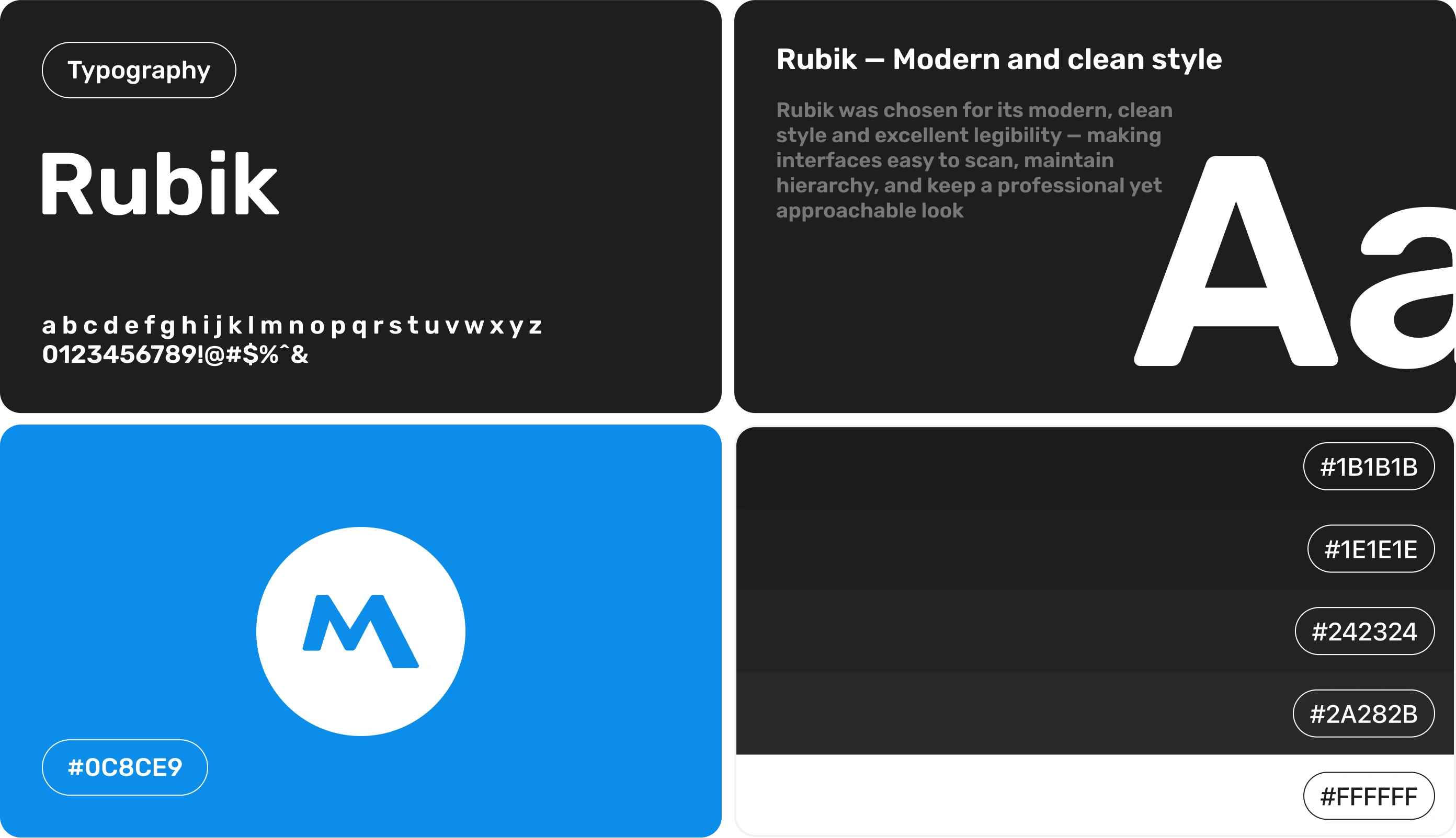 Rubik was chosen for its modern, clean style and excellent legibility — making interfaces easy to scan, maintain hierarchy, and keep a professional yet approachable look