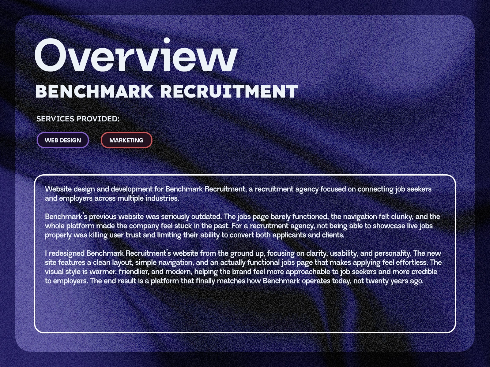 Website design and development for Benchmark Recruitment, a recruitment agency focused on connecting job seekers and employers across multiple industries.