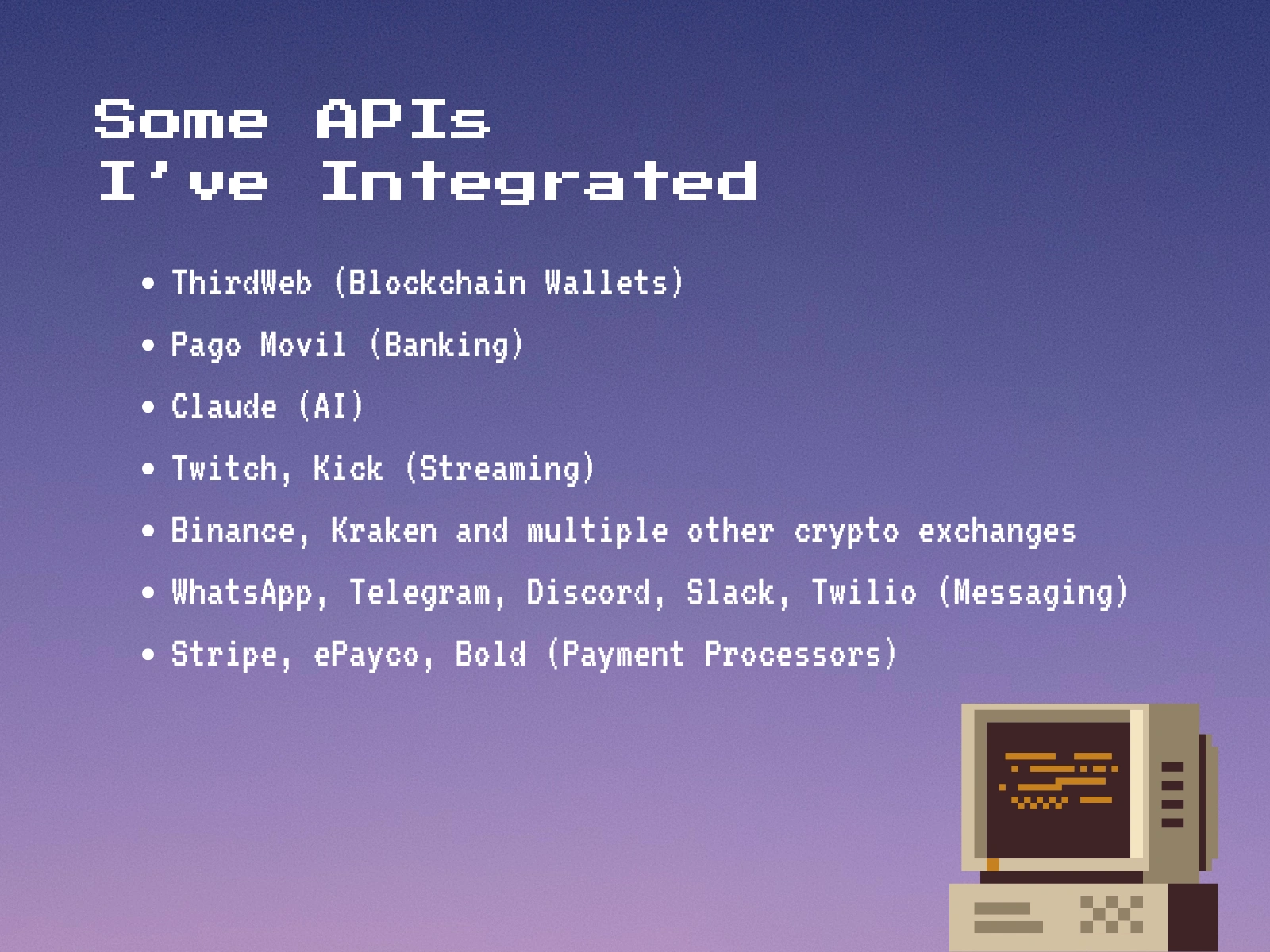 I've integrated a wide range of API's in clients projects, from simple notifications to banking and blockchain.