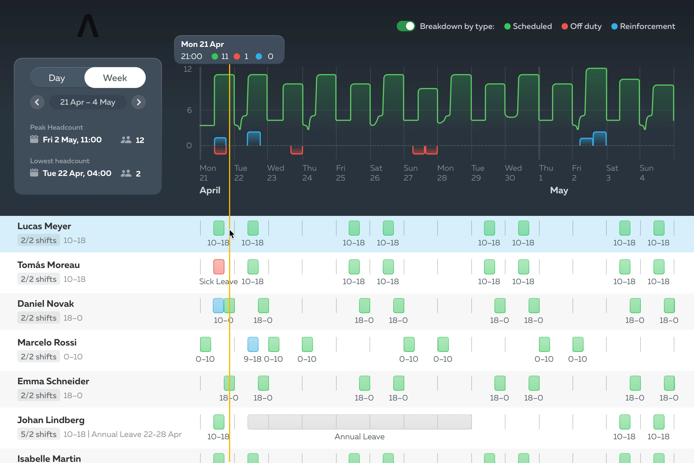 The compact layout shows who’s working when, while the live graph reveals peaks, gaps, and real-time headcount.