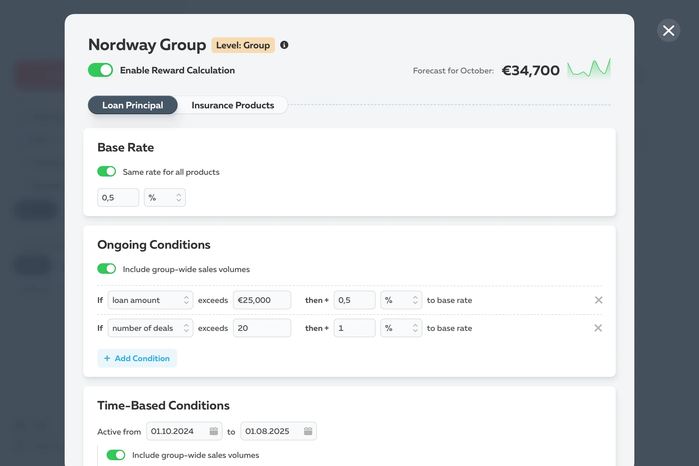 Turns complex bonus logic into a clear, interactive interface — with if-then rules, group presets, and live forecasts. Built to support both company-wide and individual incentives.