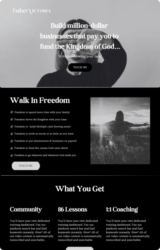 Simple landing page design for a coach who offers 1:1 Coaching and Coaching Program.