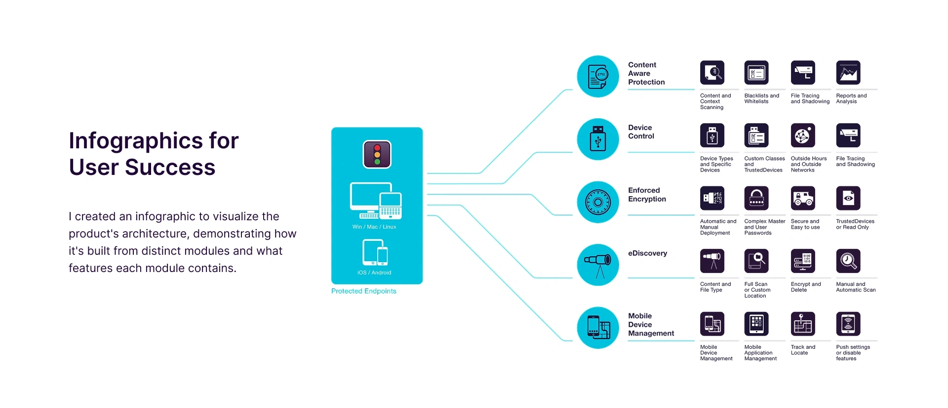 To help users fully understand the product's architecture and capabilities, I created a series of infographics. These visuals demonstrated how the product is built from distinct modules and what specific features each module contains. This was a key tool for both new user onboarding and for the sales team to clearly communicate the product's value.