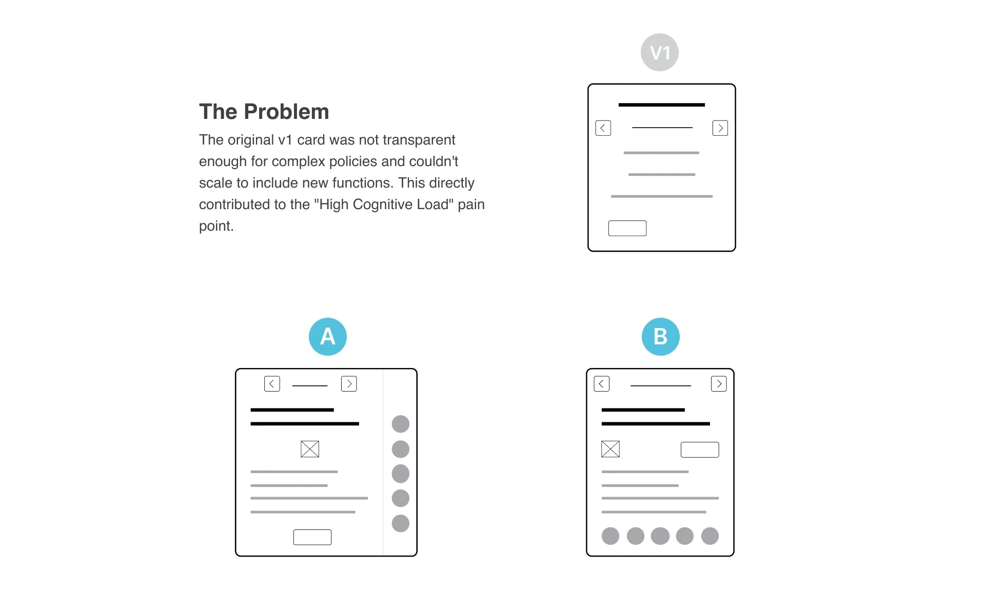 One of the biggest sources of user frustration was the lack of at-a-glance information. The policy cards became a mini case-study in solving this problem.