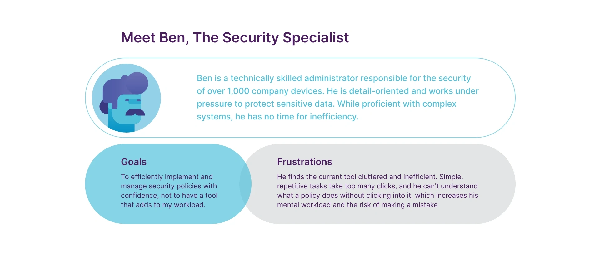 We mapped out Ben's journey of creating and applying a security policy to pinpoint specific moments of friction and identify key opportunities for improvement.