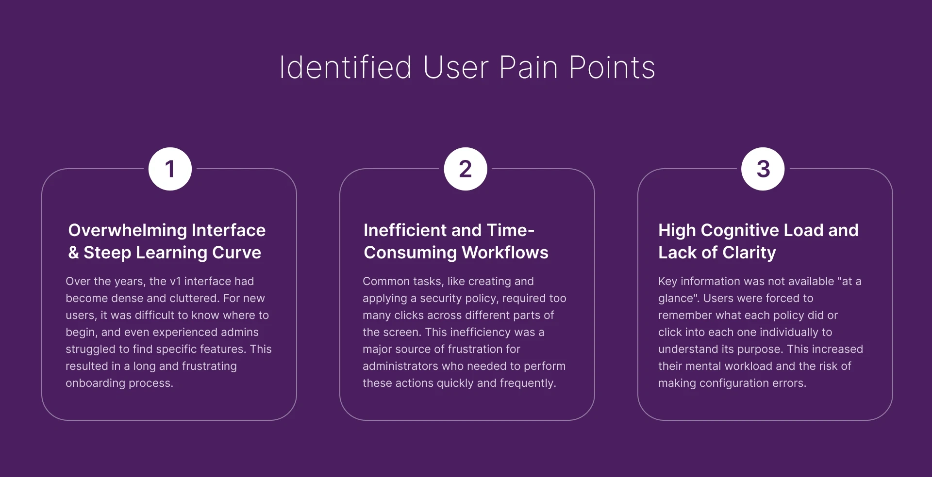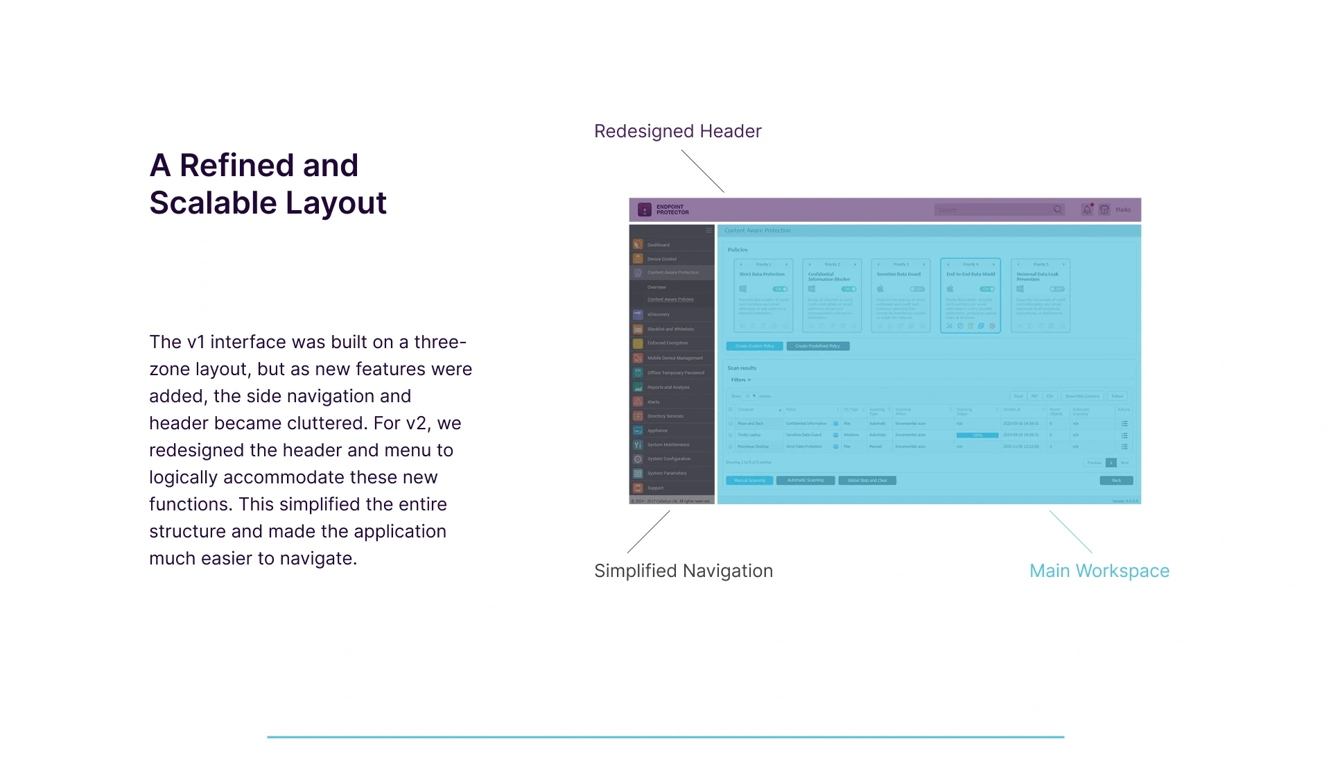A complete UX/UI redesign of a complex enterprise cybersecurity application, focusing on reducing complexity and improving usability for security administrators