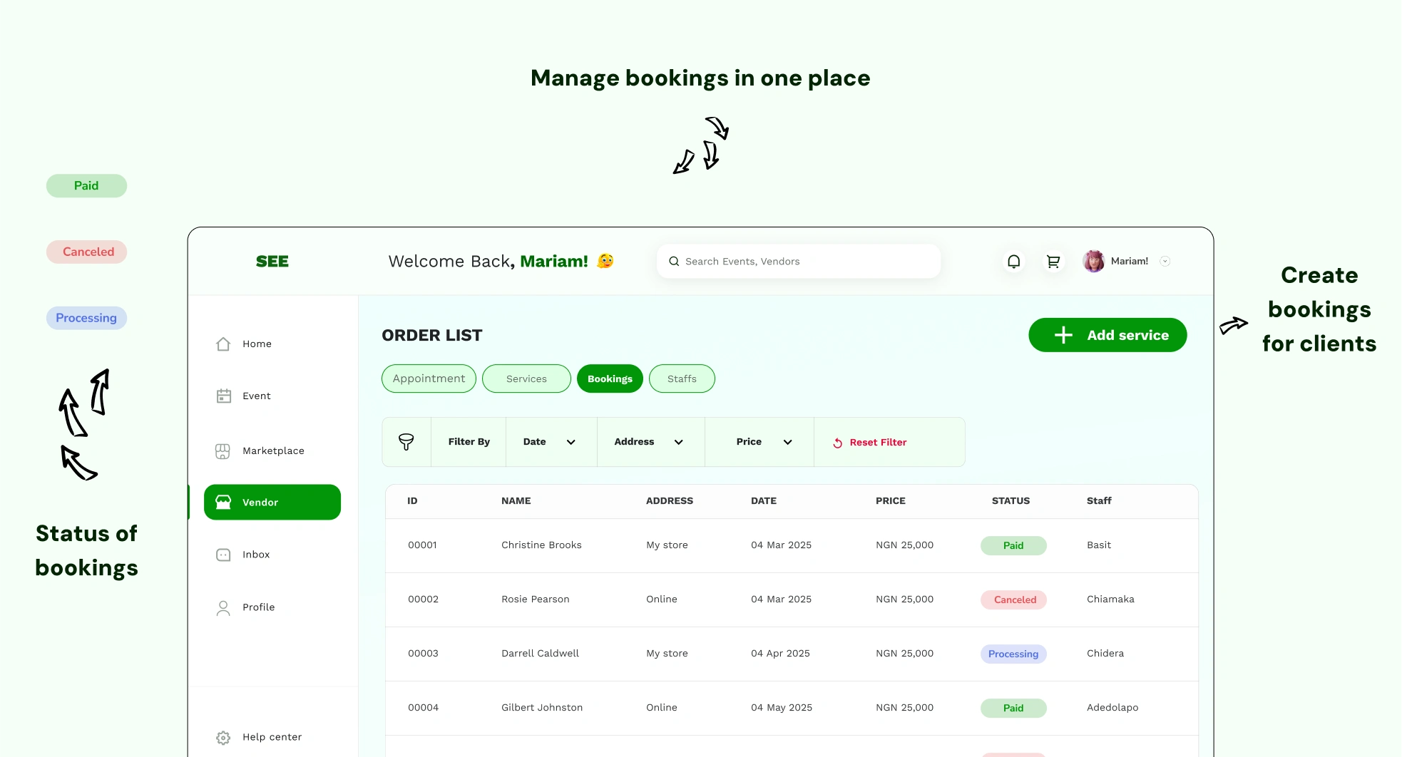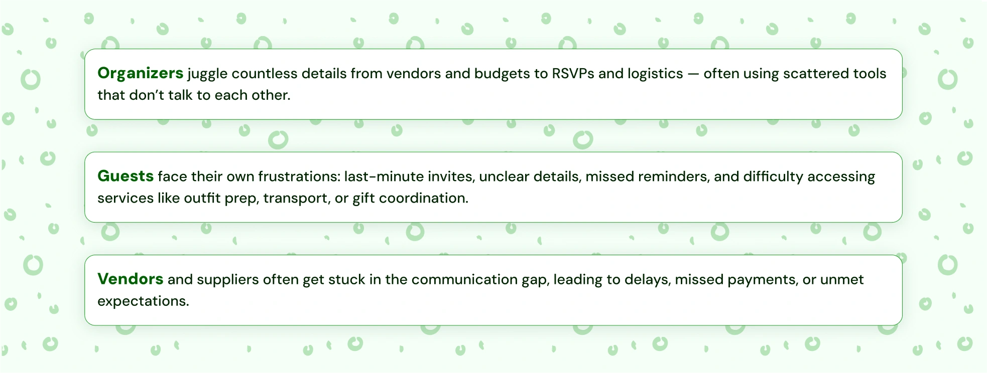 SEE is a smart, end-to-end event companion built to simplify the way people plan, manage, and attend events. Instead of scattered tools and endless back-and-forth communication, SEE brings everything into one seamless experience. For organizers, SEE acts like a co-pilot, guiding them through event creation, guest management, vendor coordination, promotions, and even post-event reporting. In short, SEE is designed to take the stress out of events, making it easier for everyone involved to focus on what really matters: the experience.
