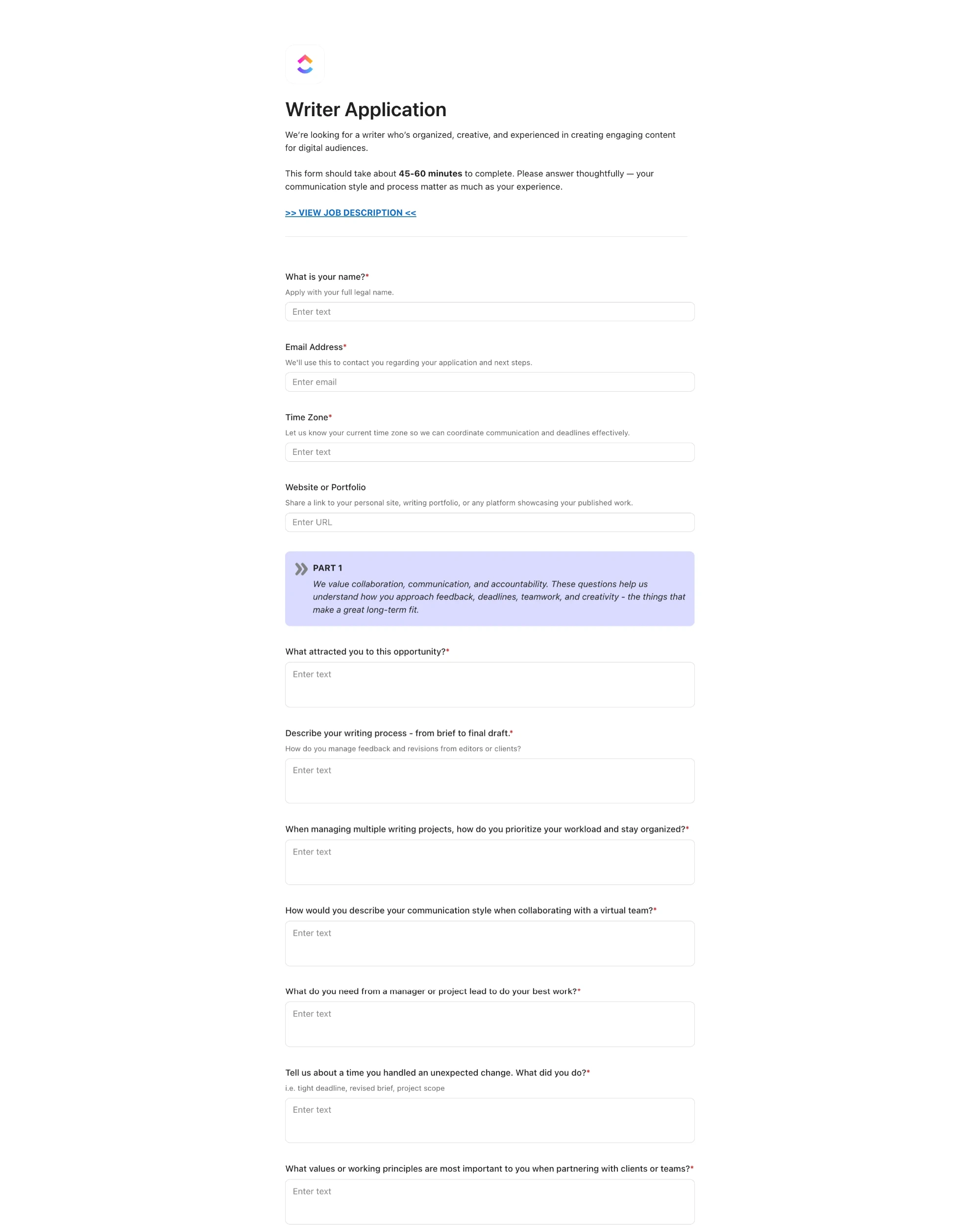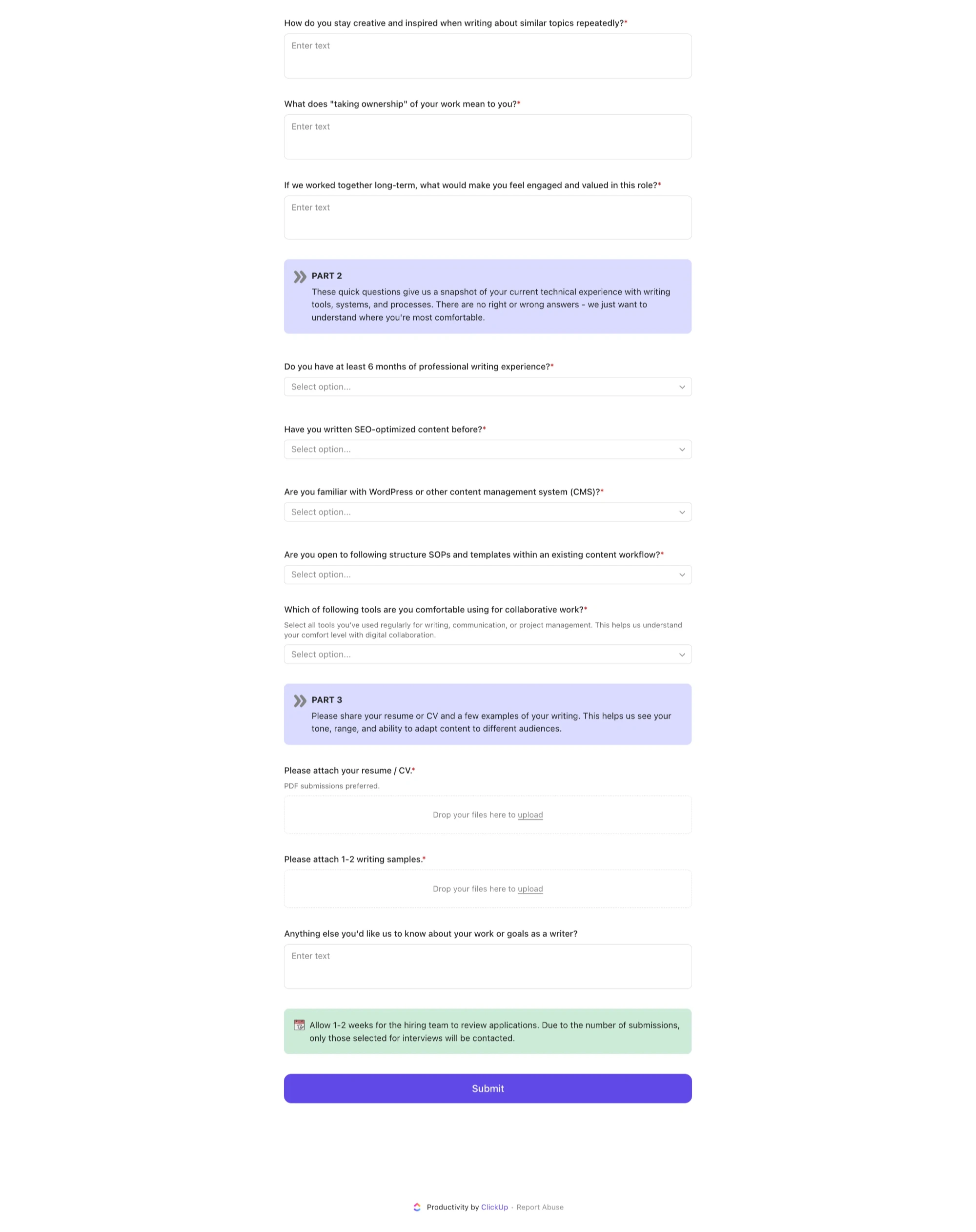 Created a detailed application form in ClickUp to hire a content writer.