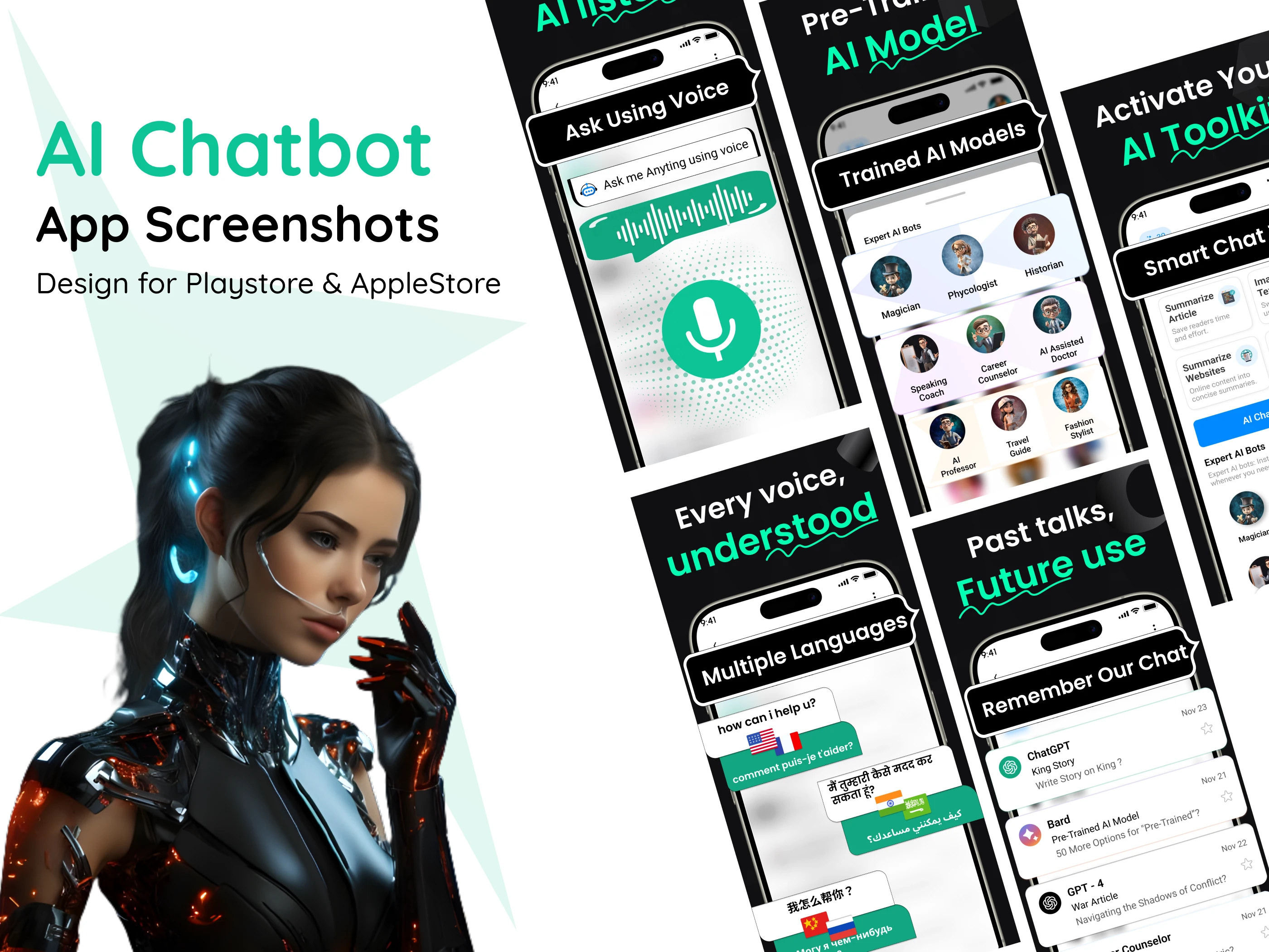 Professional App Store Screenshot design for an AI Chatbot Mobile App. Built in Figma to ensure an elegant layout that highlights app functionality .