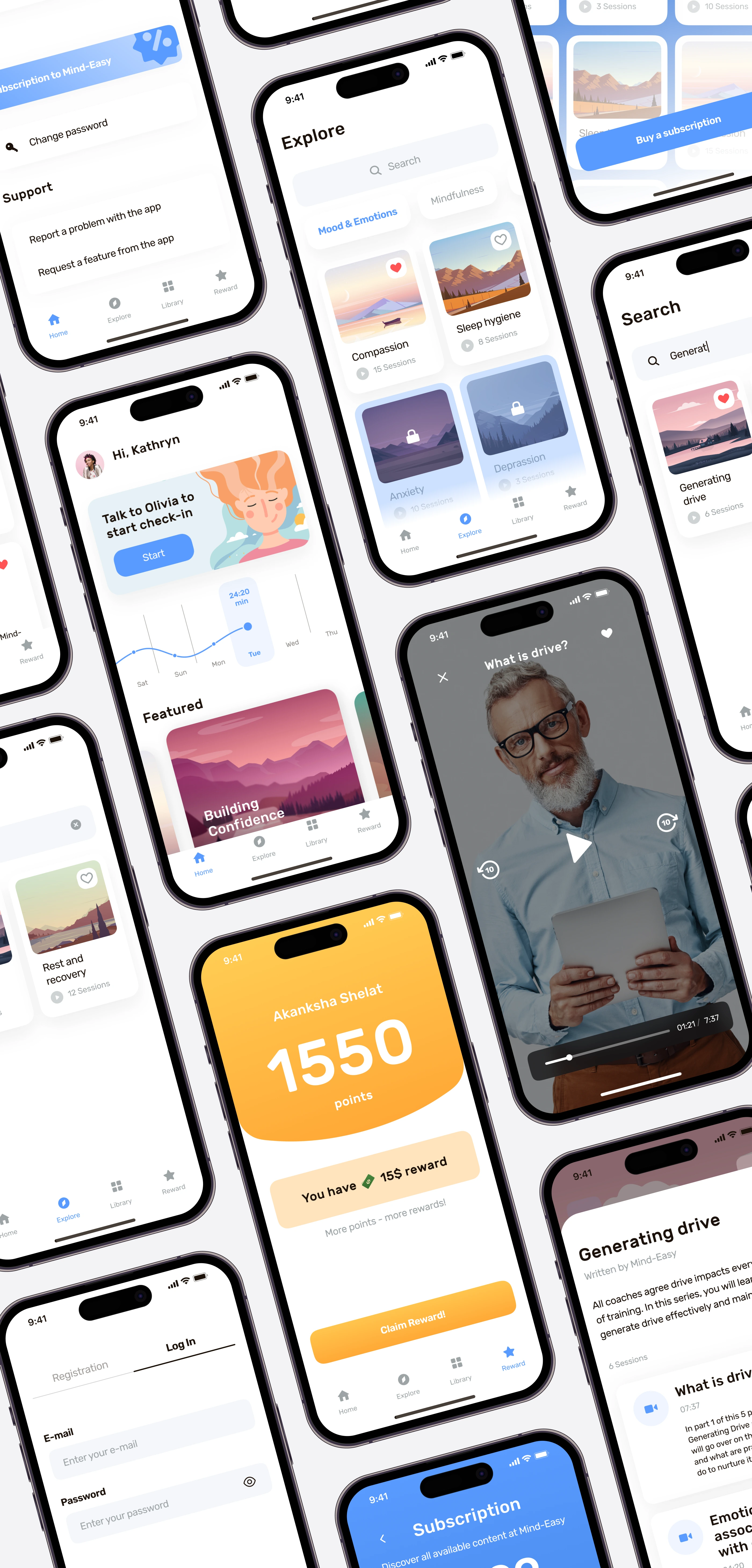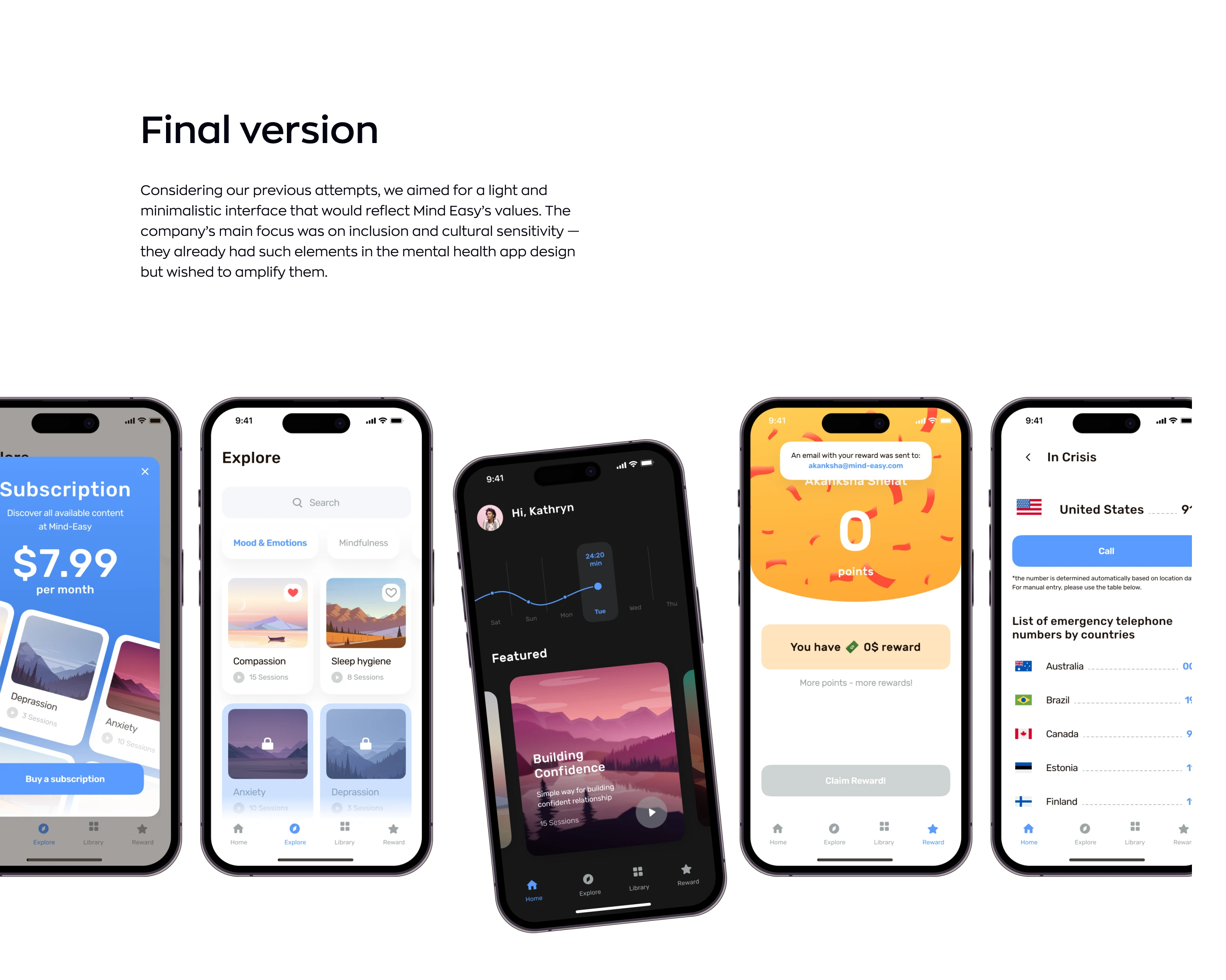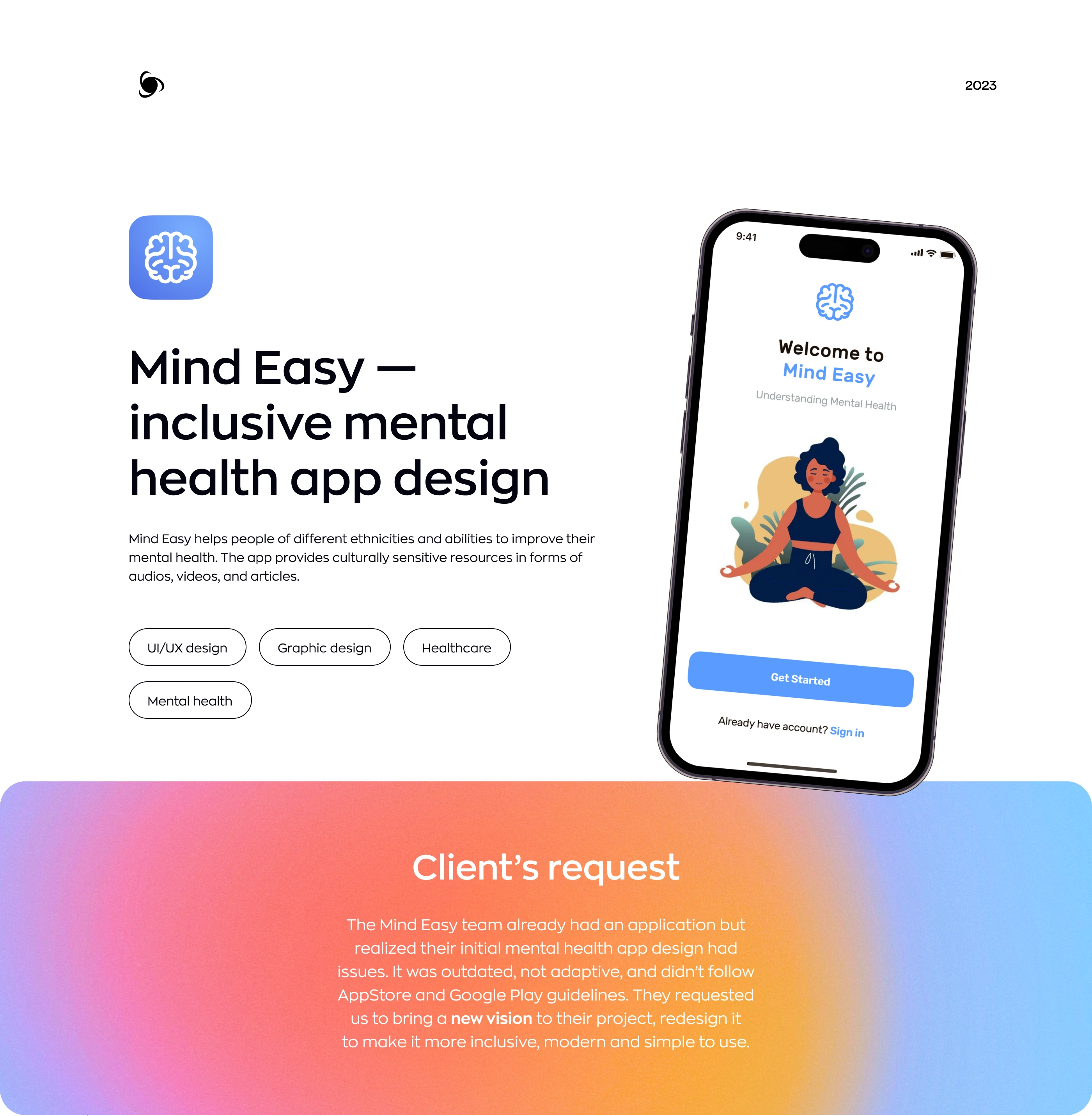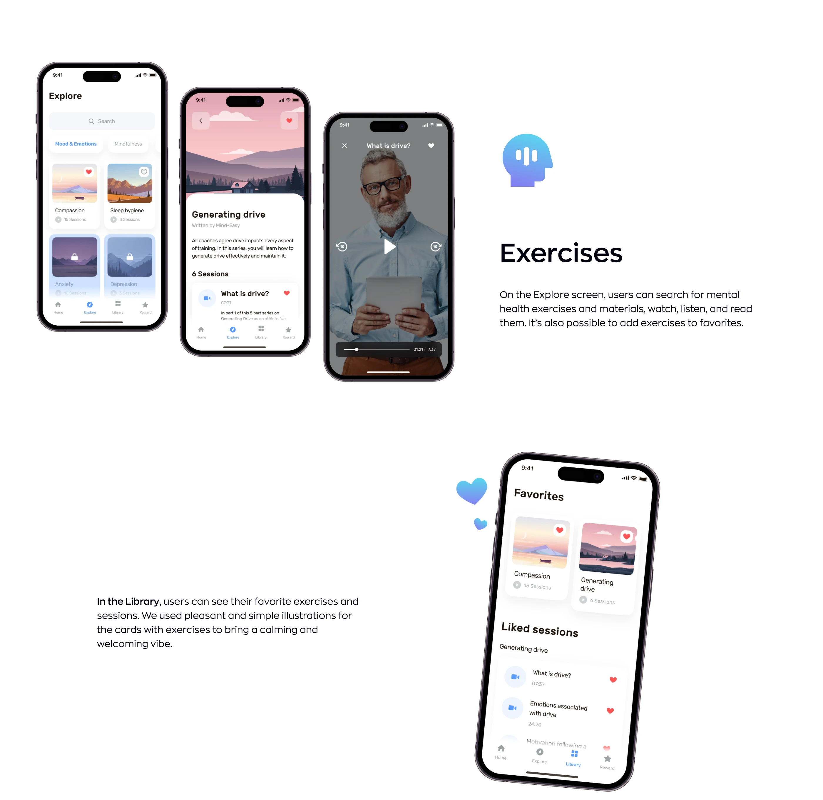 Our team redesigned the Mind Easy mobile mental health app, conducting competitor research, experimenting with styles, and creating a minimalistic interface.