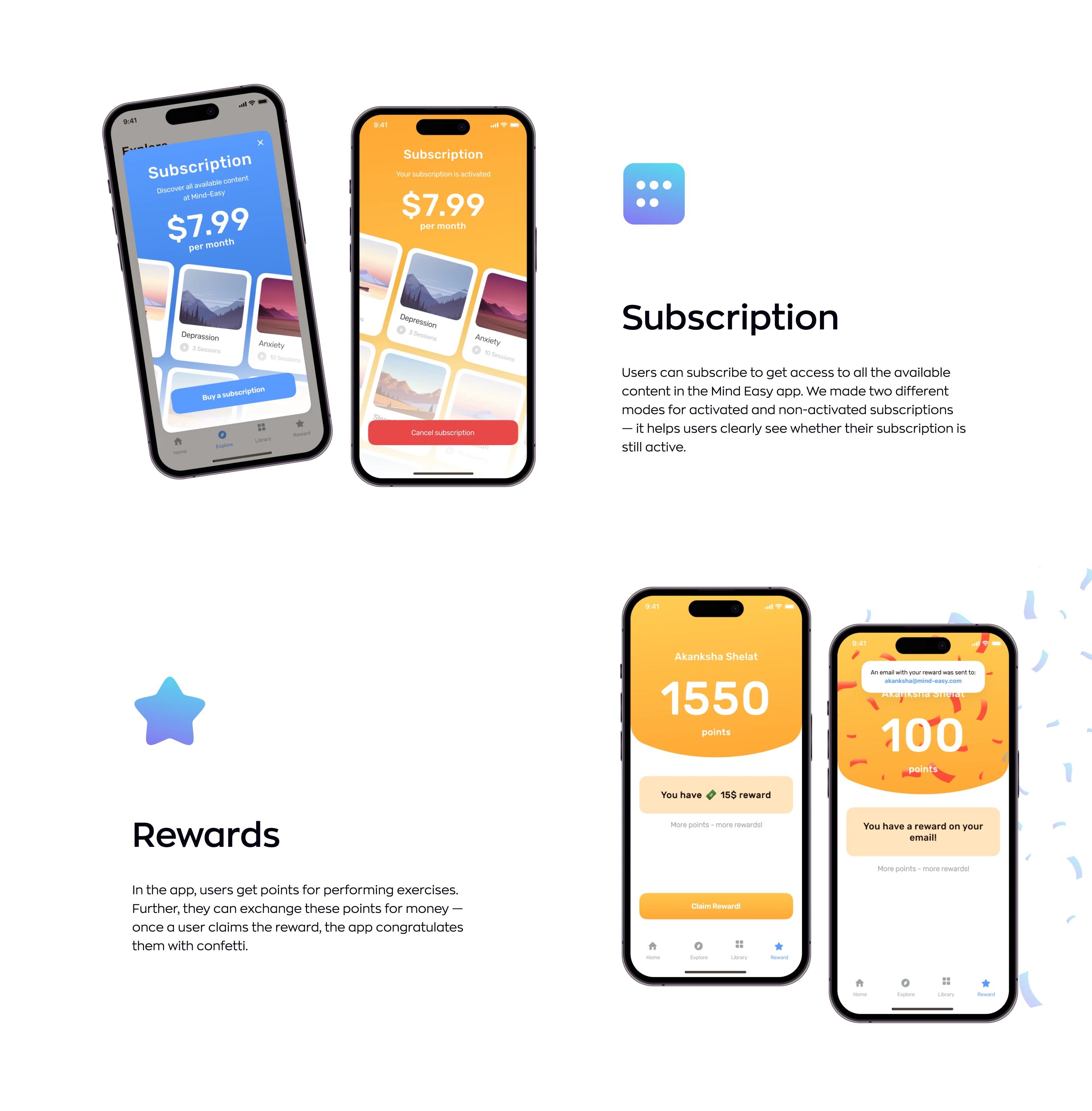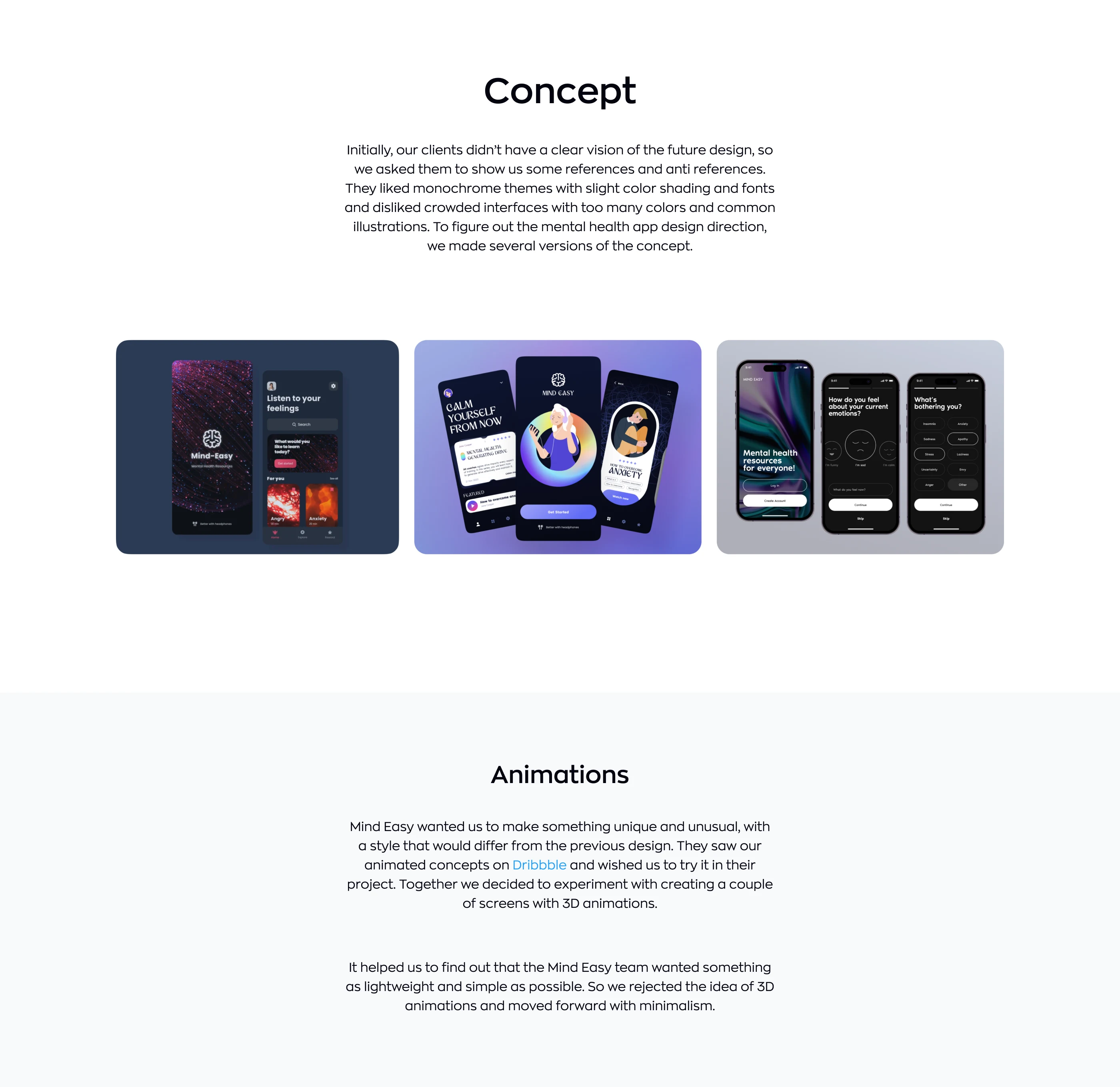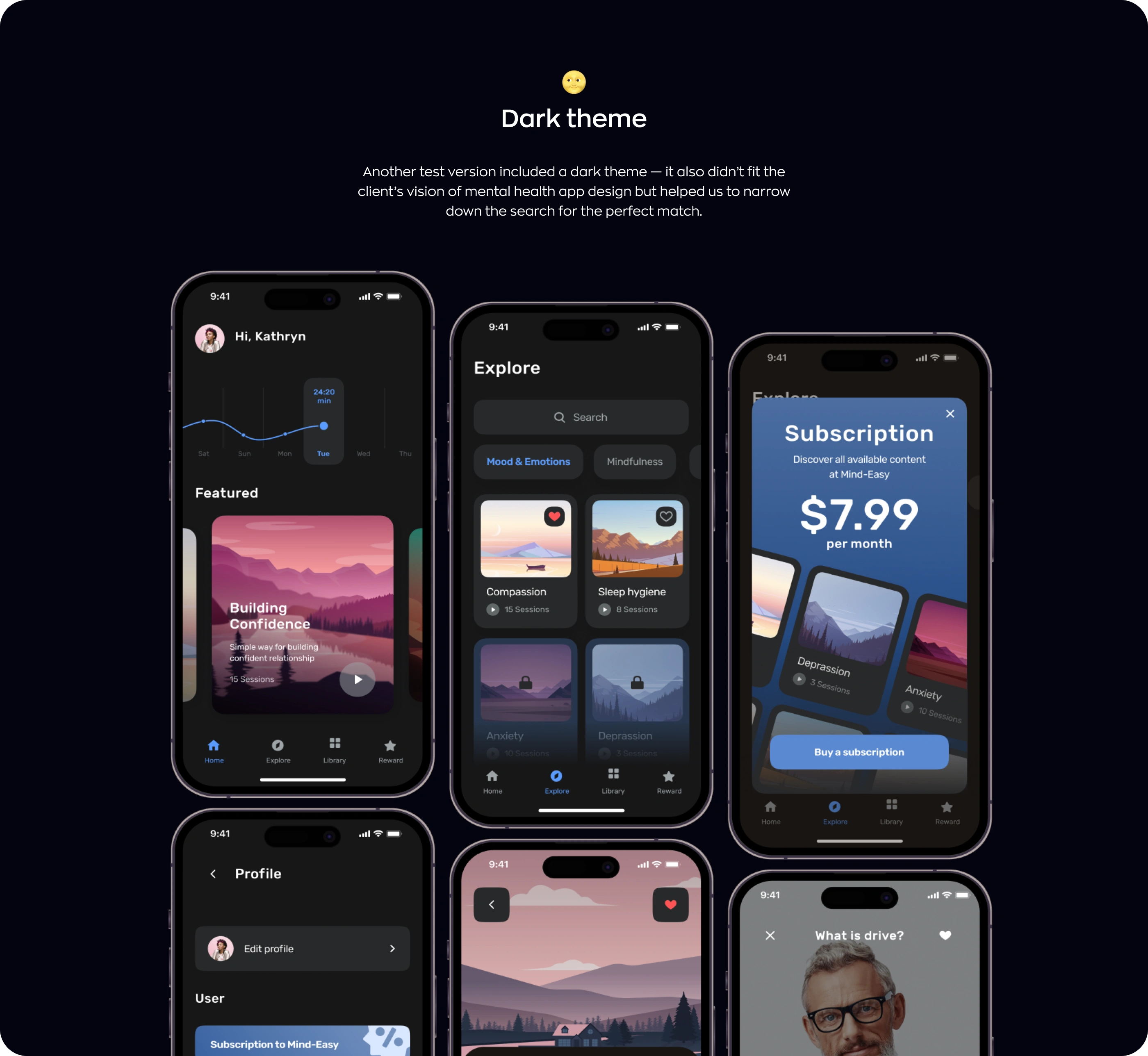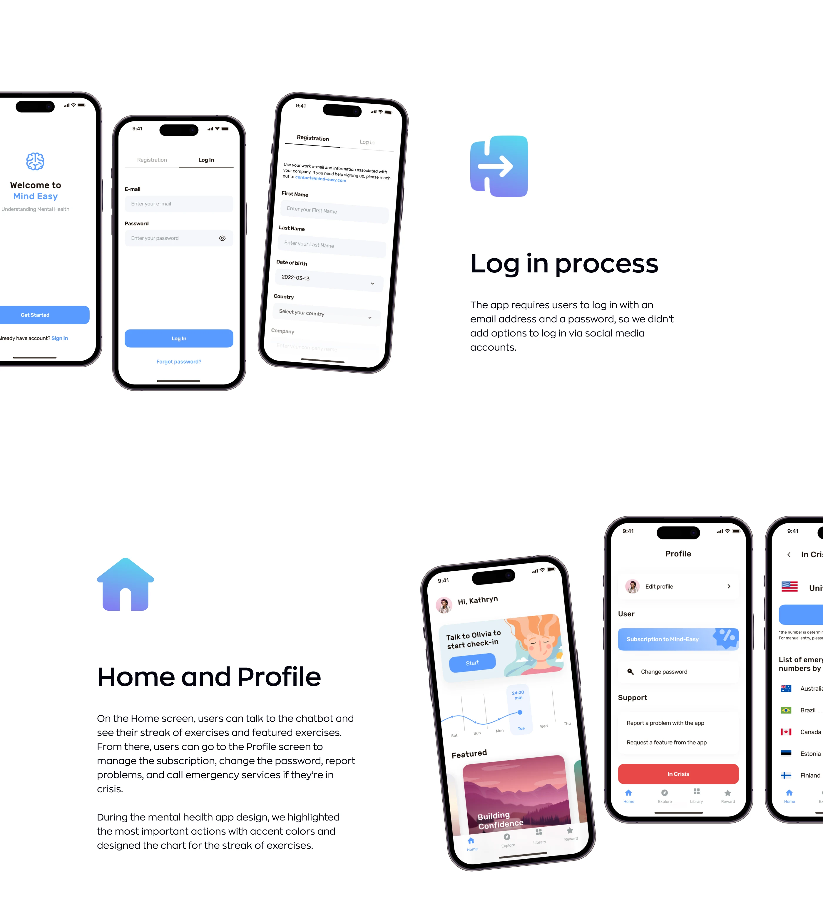 Our team redesigned the Mind Easy mobile mental health app, conducting competitor research, experimenting with styles, and creating a minimalistic interface.