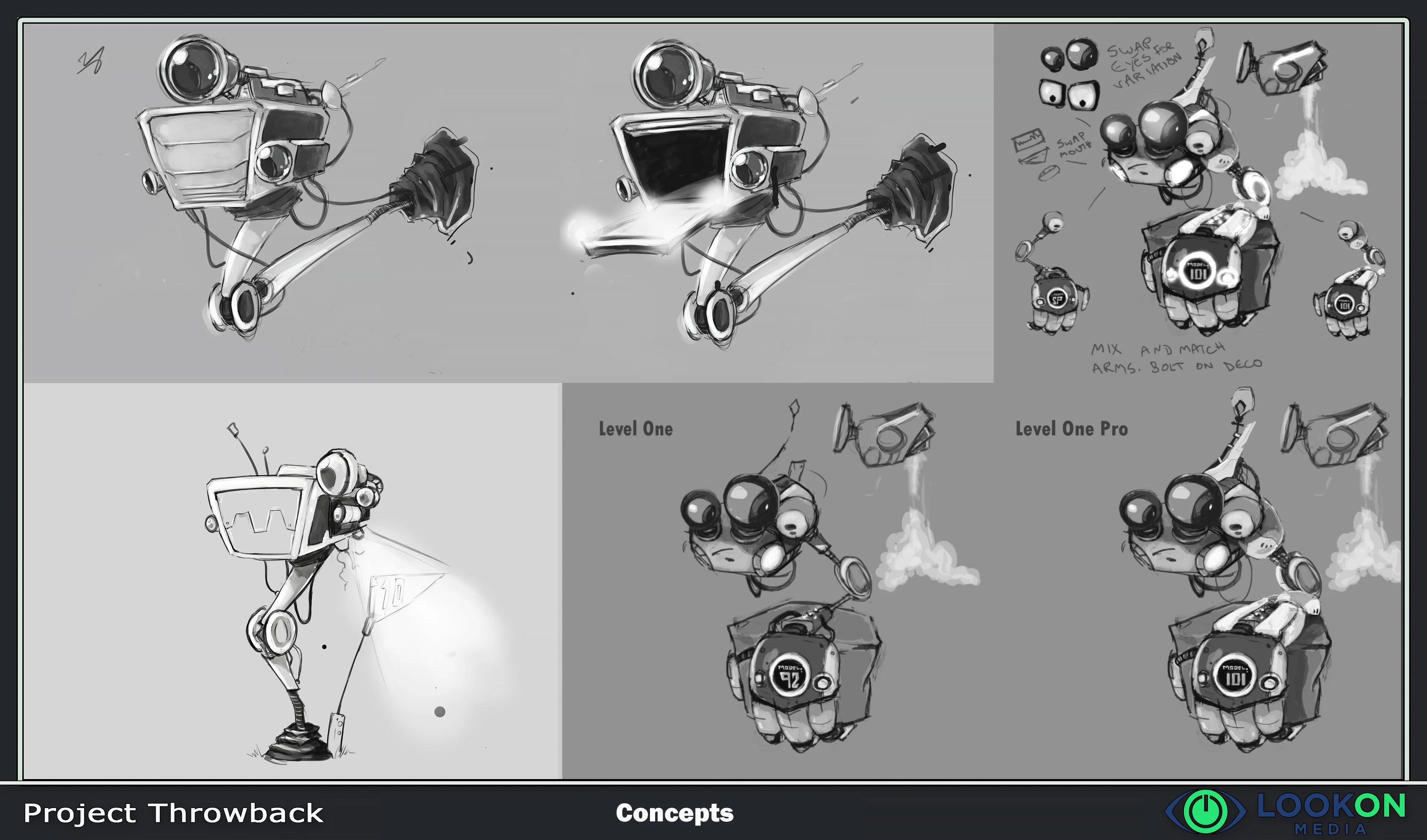 These are some concepts I did to figure out what the Mailboxes and Drone Enemies would look like. I was also factoring in modeling pipelines to the design to get as much varation as we could without having to build everything from scratch.