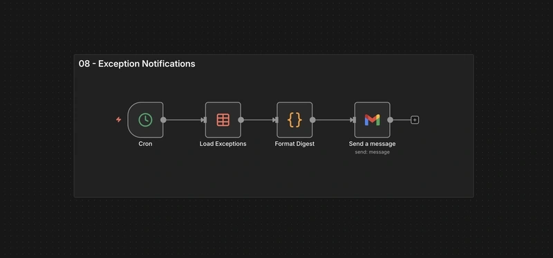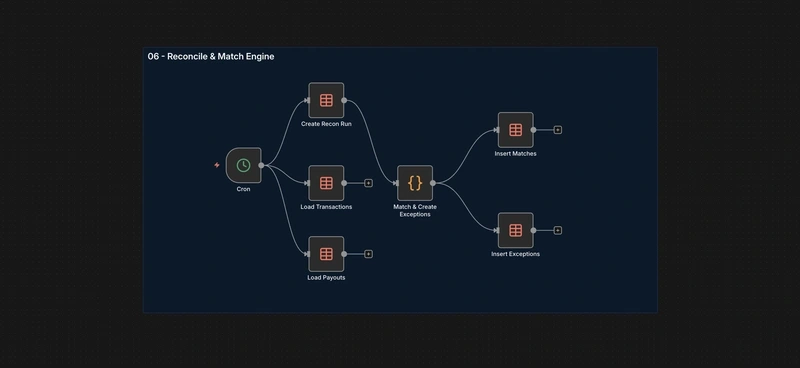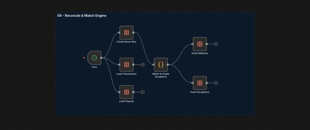 This project is a production-style reconciliation automation built with n8n + PostgreSQL (portable to any Postgres setup) with Python logic inside n8n code nodes.