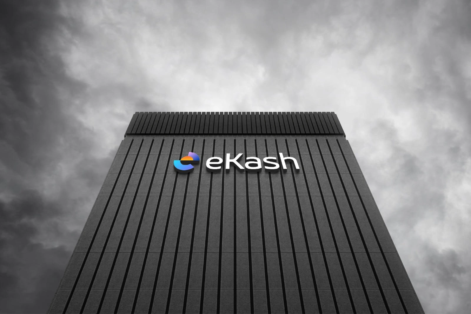eKash appears to be a modern, tech-oriented brand with a focus on innovation, creativity, and vibrant visual identity. The branding successfully integrates a clean sans-serif wordmark with a dynamic, circular logo that uses a spectrum of gradient colors ranging from aqua blue to warm orange and violet. The visual identity suggests a company that's forward-thinking, tech-savvy, and design-conscious.