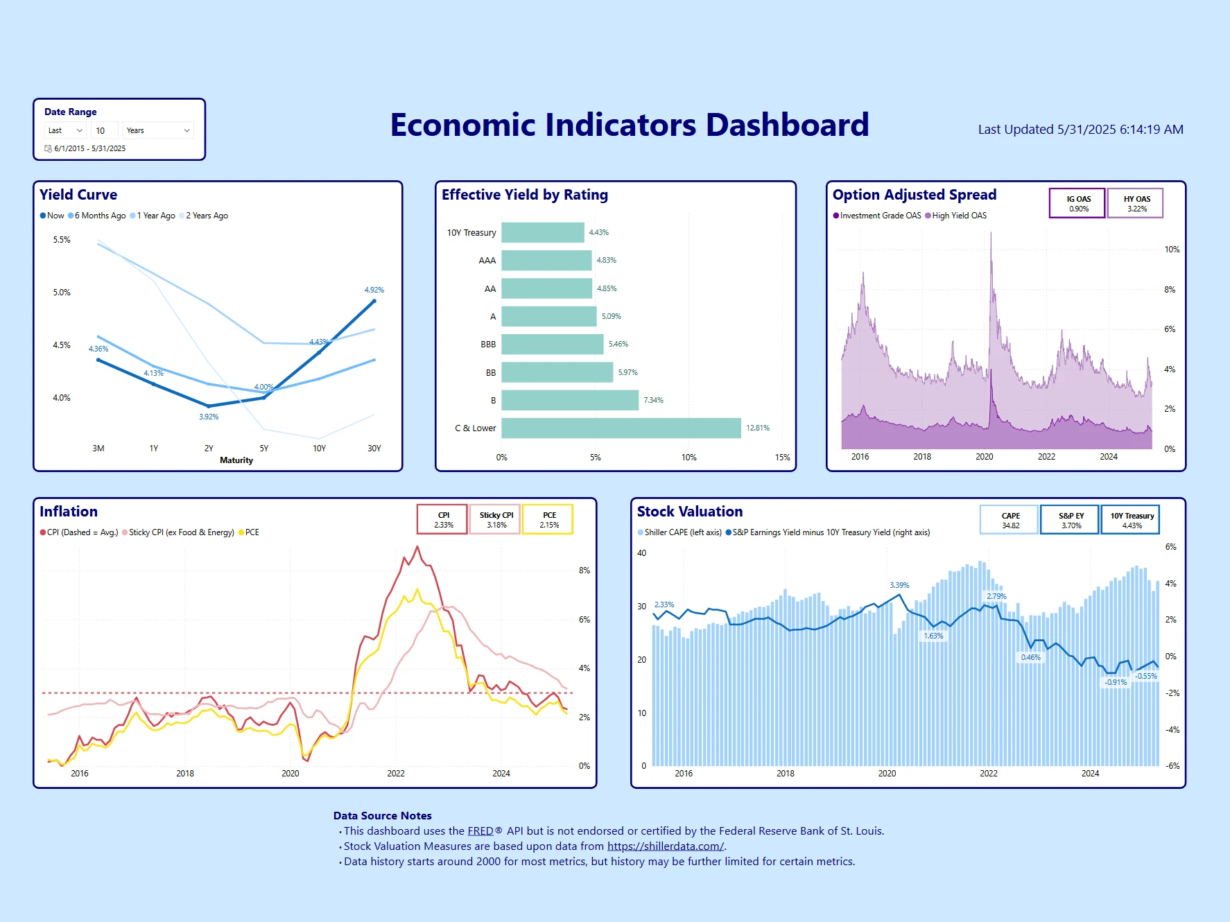 Power BI dashboard integrating various FRED metrics and Shiller data