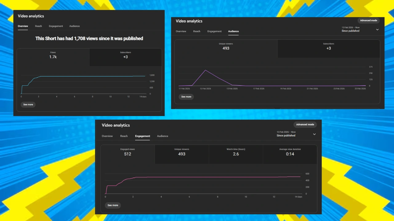 This YouTube Short pulled 1,708 views 🚀, reached 493 unique viewers 👀, generated 512 engaged views 🔥, and added +3 subscribers 📈 — all organically. Most of the traction came in the first 48 hours, showing a strong hook and solid retention with an average watch time of 14 seconds ⏱️ and 2.6 hours total watch time. The sharp Day 1 spike proves the algorithm tested it… and it delivered. Clean editing, tight pacing, and strategic storytelling made the difference 🎬✨
