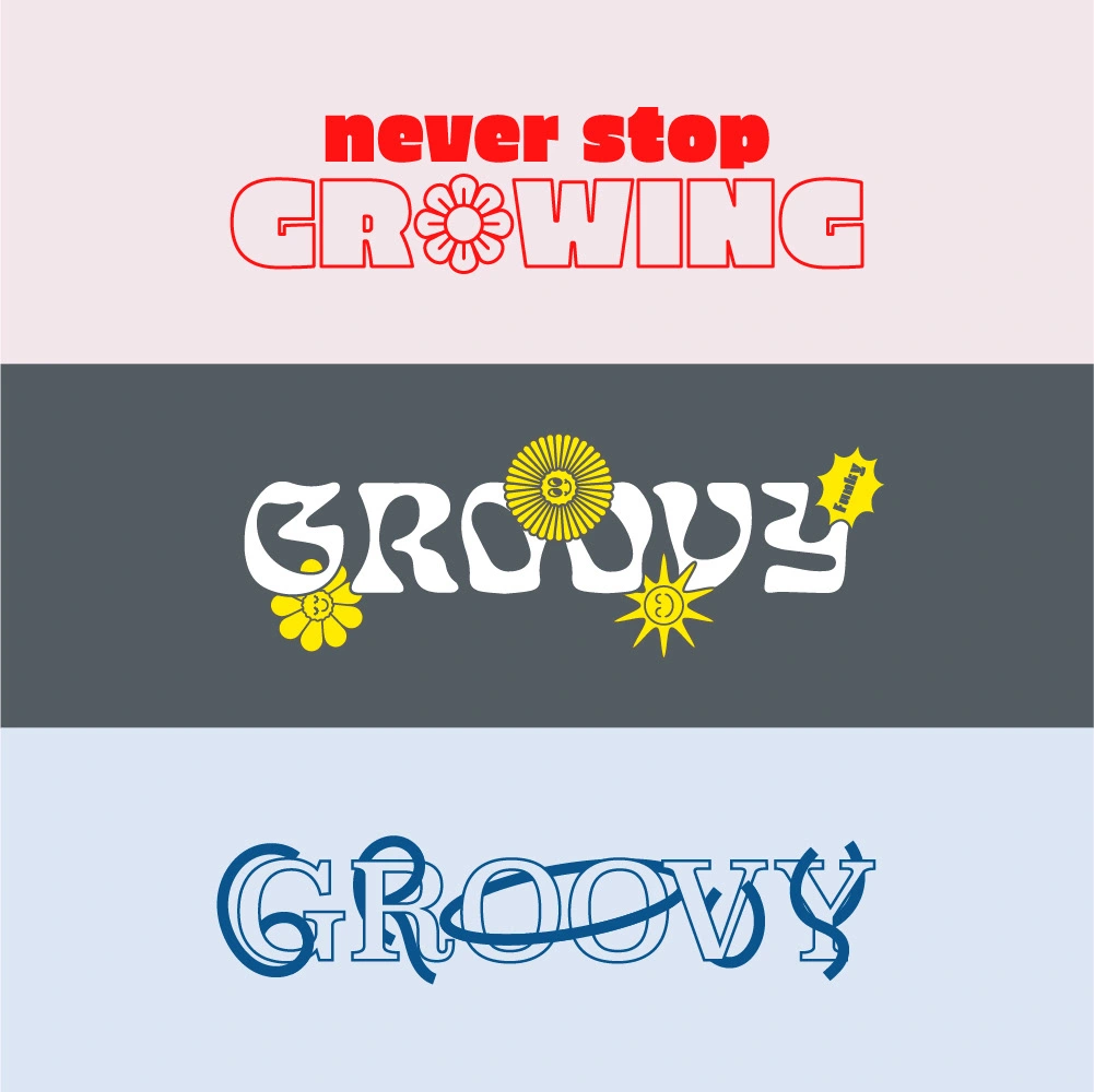 To combat visual stagnation, I engineered a highly versatile logo system where the core "Groovy" name remains constant, while surrounding elements (illustrations, typography, and resources) continuously evolve. This extensive asset library allows the brand to refresh its apparel graphics each season without losing recognition. Scroll down to see the final logo variations and how the designs were prepared for screen printing.