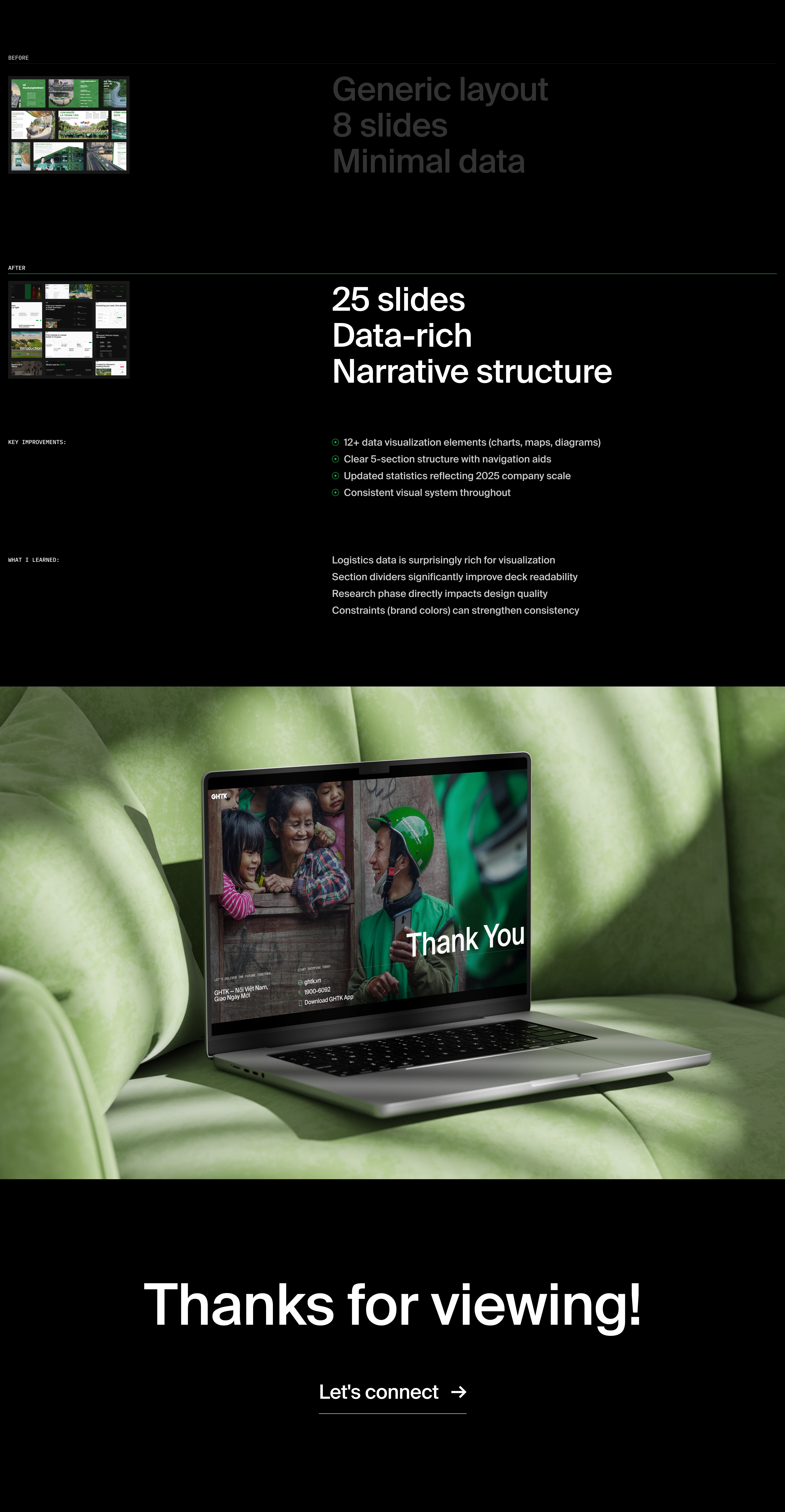 The original deck had basic stats and generic layouts. My goal: transform dry logistics data into visual stories that actually land.