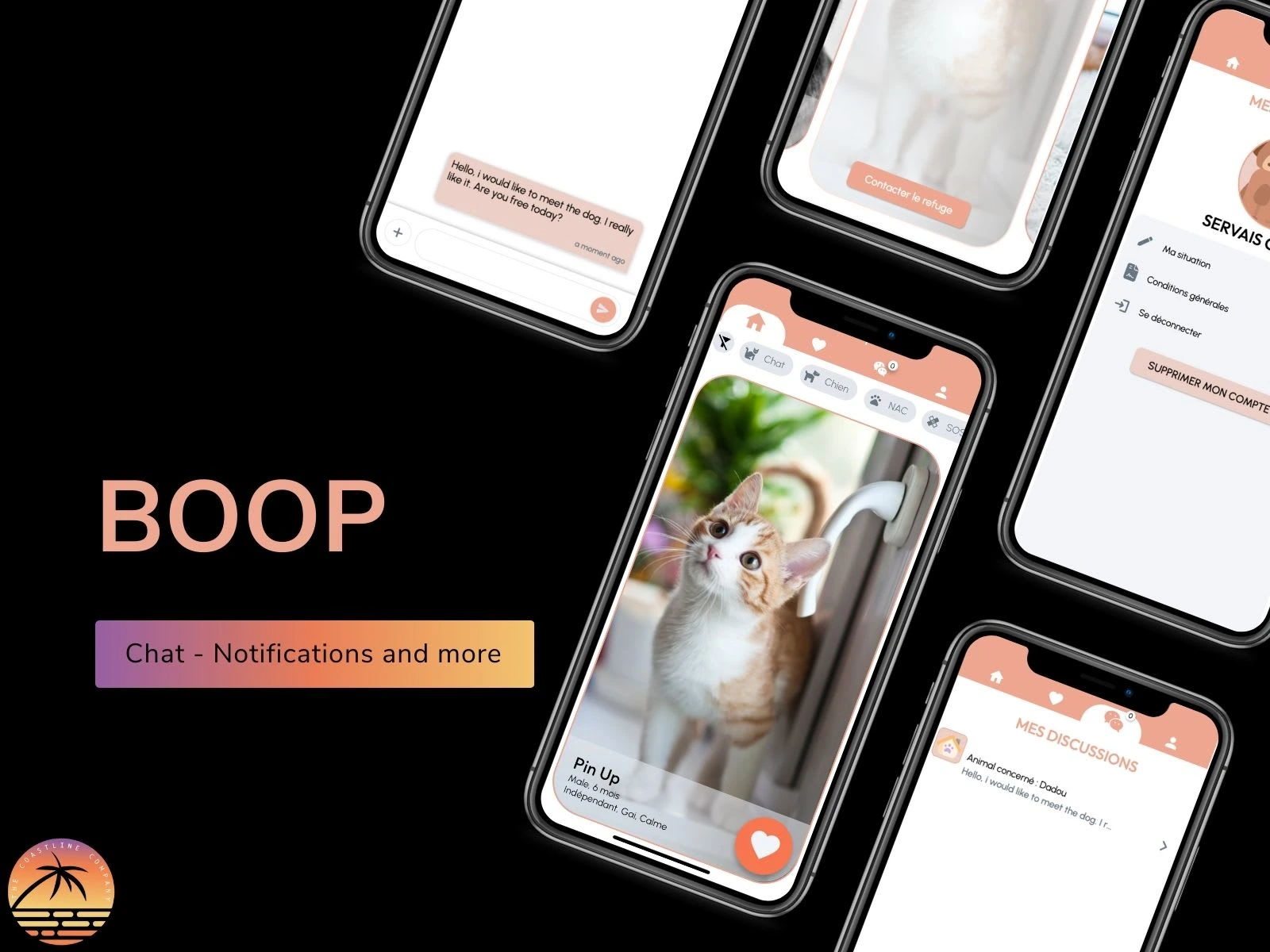 Boop is an MVP with swipable cards to browse animals nearby (within 50km via Algolia), with chat and real-time notifications with shelters.