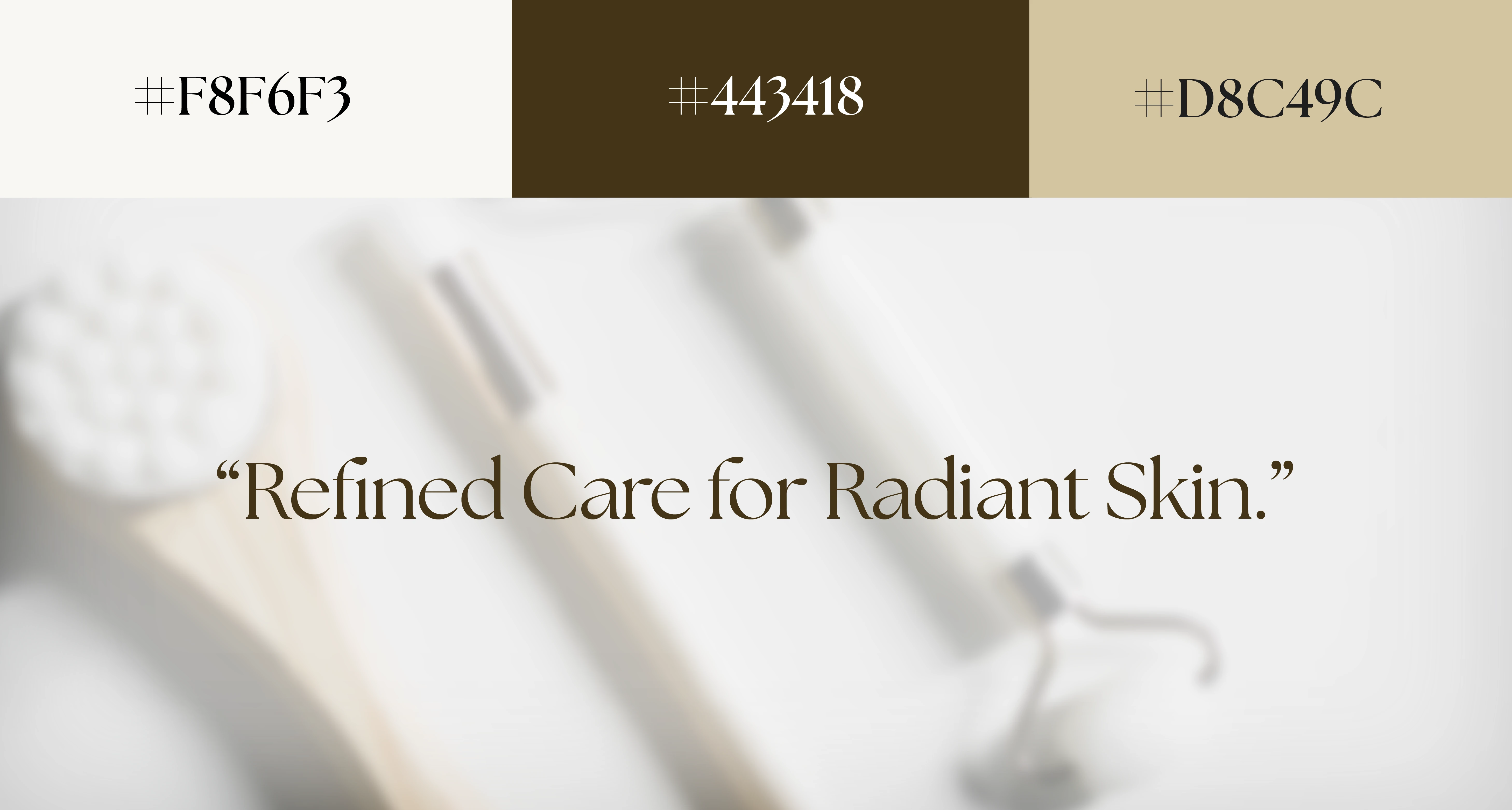 The brand suite includes a primary logo, secondary mark, and logomark to ensure flexibility across packaging and digital platforms. The tagline, “Refined Care for Radiant Skin,” grounds the brand’s tone, balancing luxury with a sense of gentle approachability.