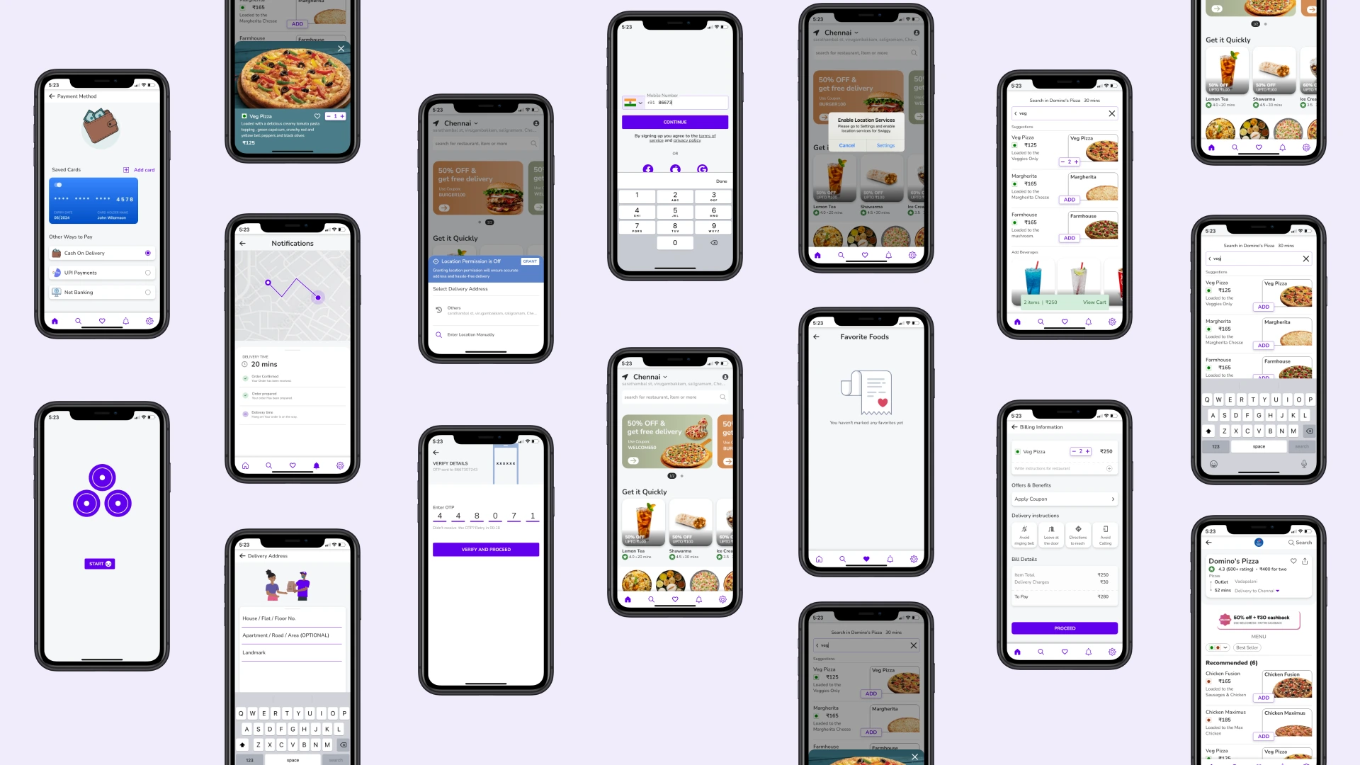 Food delivery app UI showcasing end-to-end flows including onboarding, location access, browsing, ordering, payments, and order tracking.