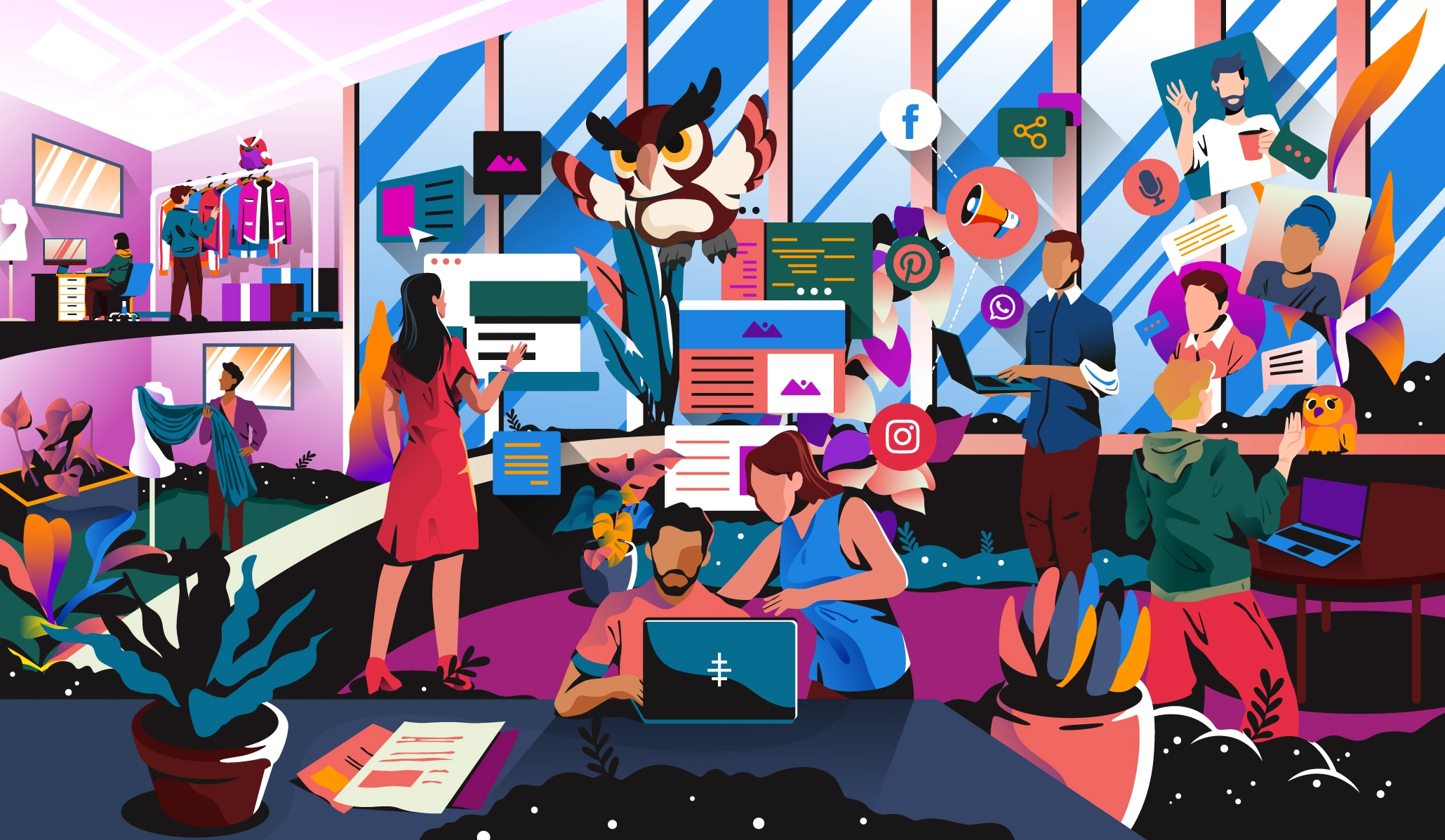 An illustration capturing the dynamic workflow of a modern creative studio—collaboration, technology, and imagination in motion.