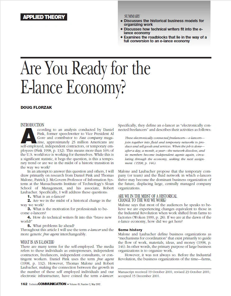 Journal article written for the Journal Technical Communication discussing the emergence of the E-lance Economy.