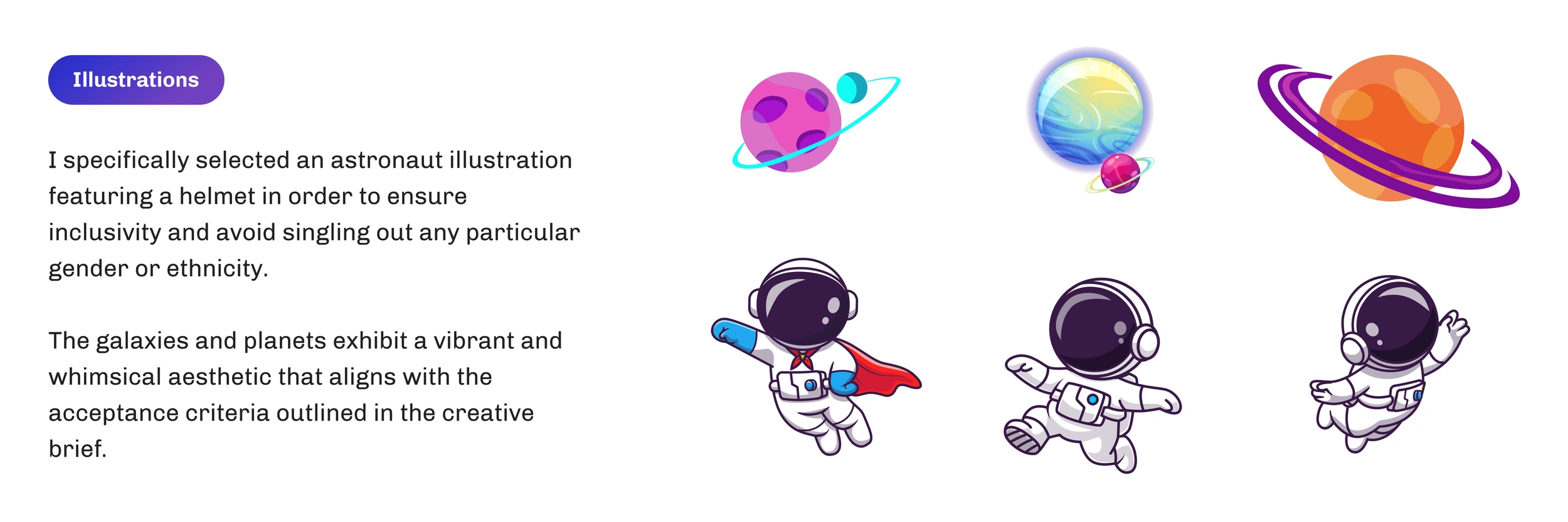 Challenge & Solution: The previous iterations didn ’t adhere or speak to all demographic of students, so to make the character more relatable to all genders, I utilized the astronaut and the helmet.