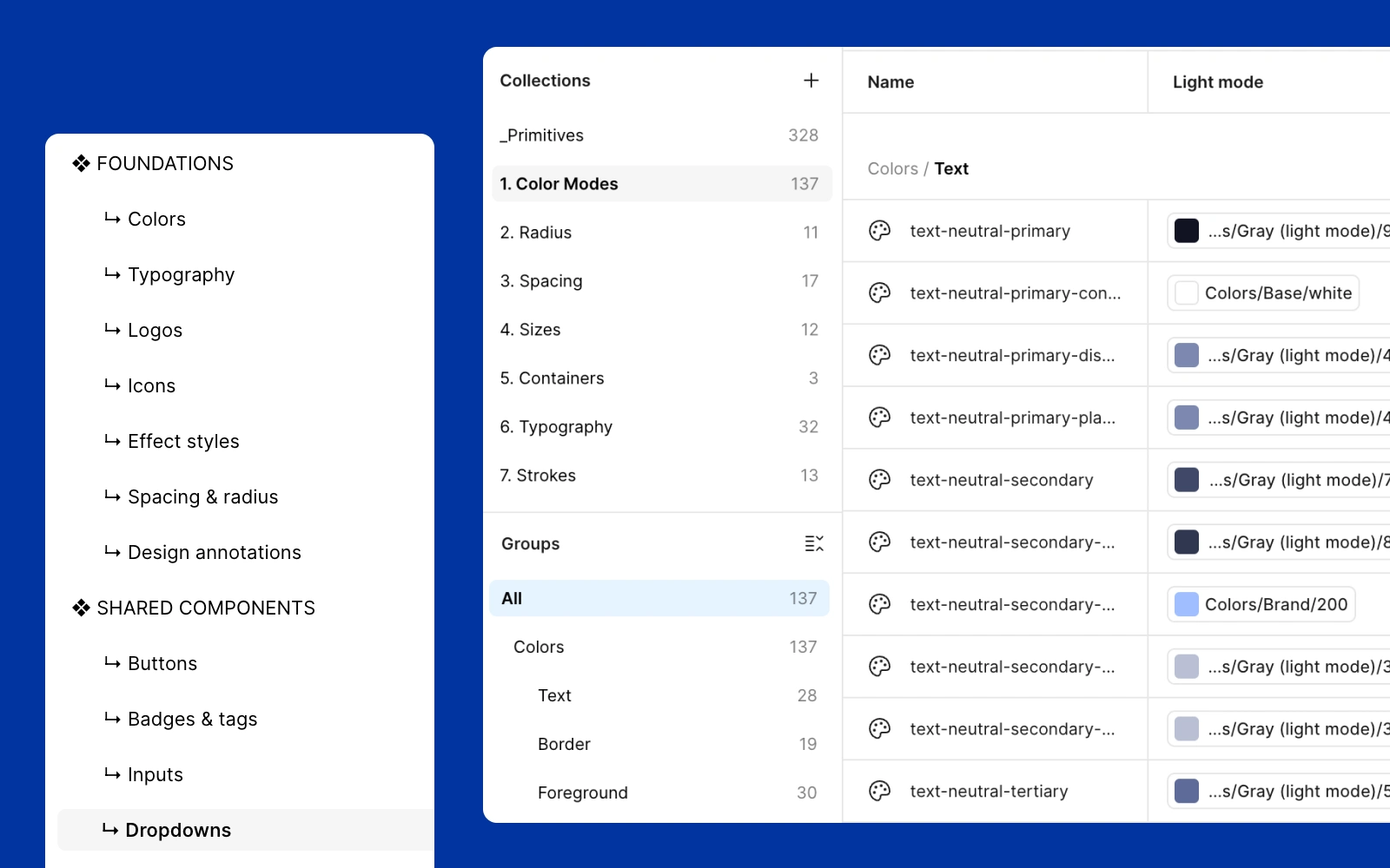 A shared UI Library file system was set up in Figma, complete with a dev-friendly scalable design token nomenclature, that allows one source of truth for styles and shared components across all current and future products