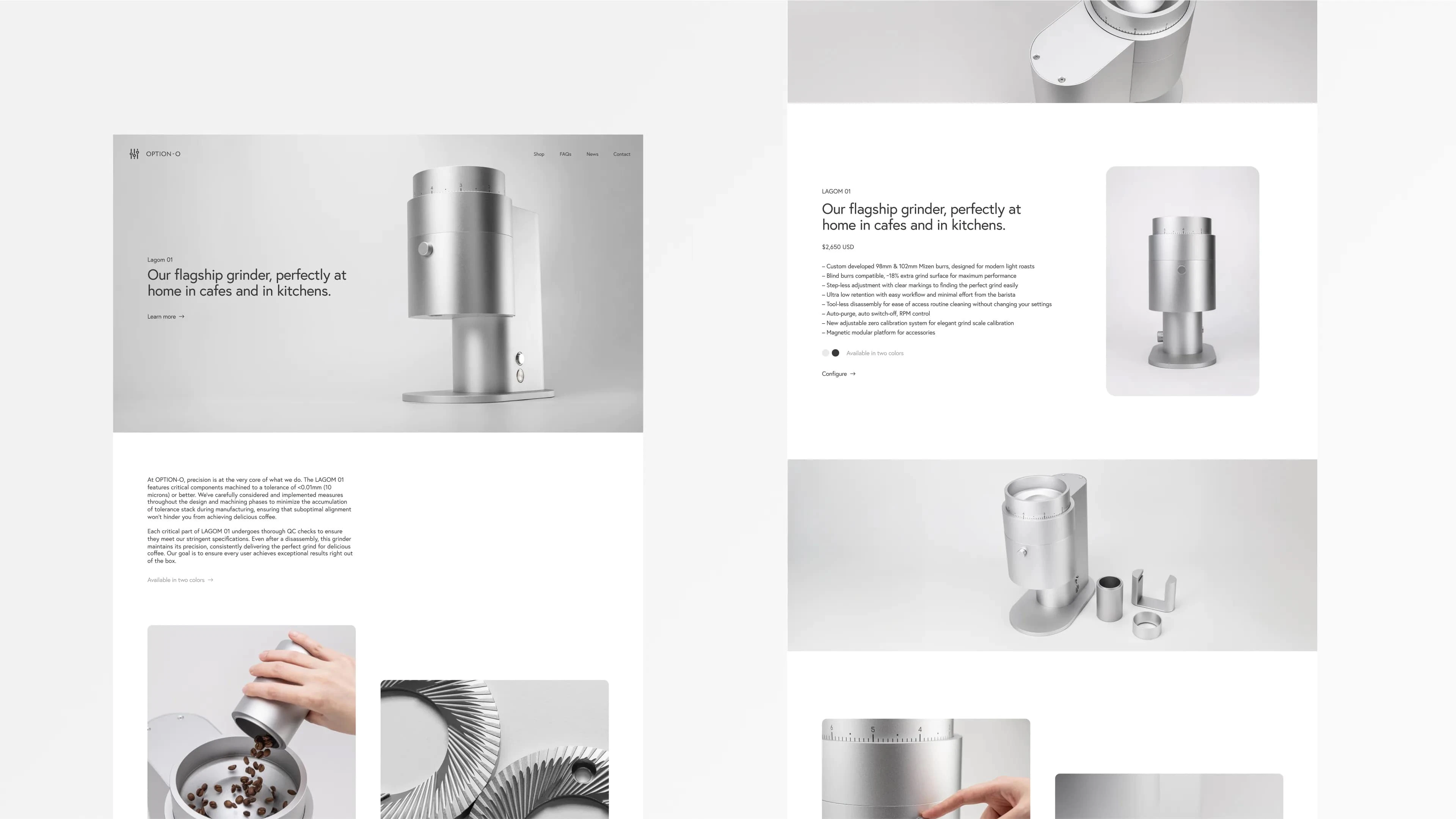Web design explorations for Option O, the Melbourne-based engineering team designing and manufacturing premium coffee grinders. The layouts that we created are for an eCommerce website on Shopify, highlighting the release of their new flagship flat burr grinder, the Lagom 01.