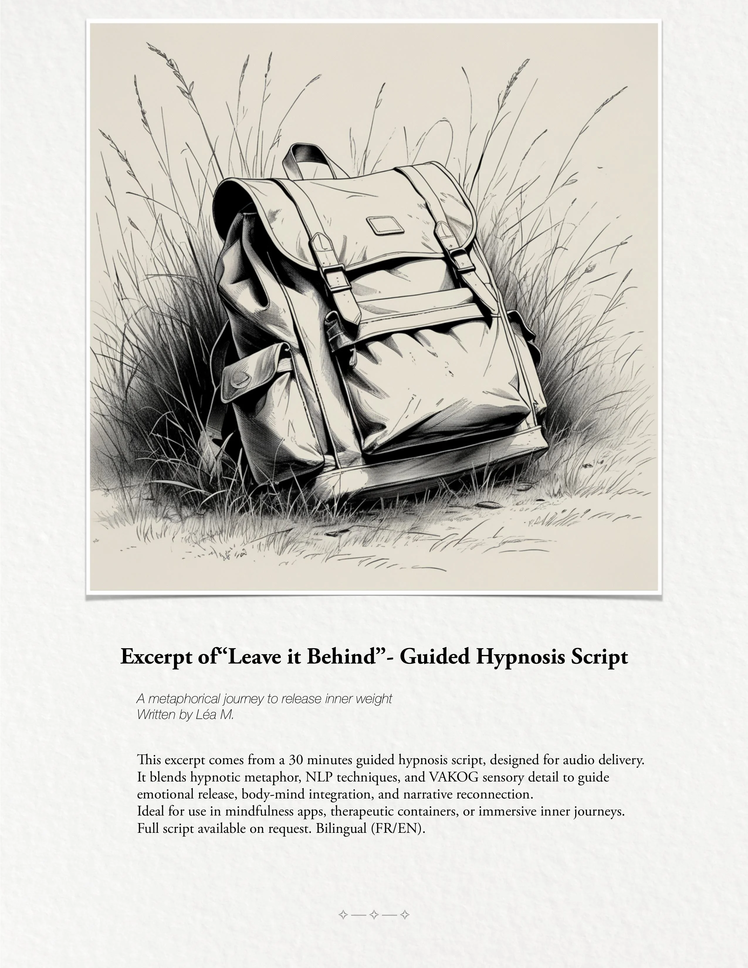 I wrote this hypnosis script using metaphor, VAKOG, and NLP patterns to support emotional release. Need something custom? I’d love to write it for you.