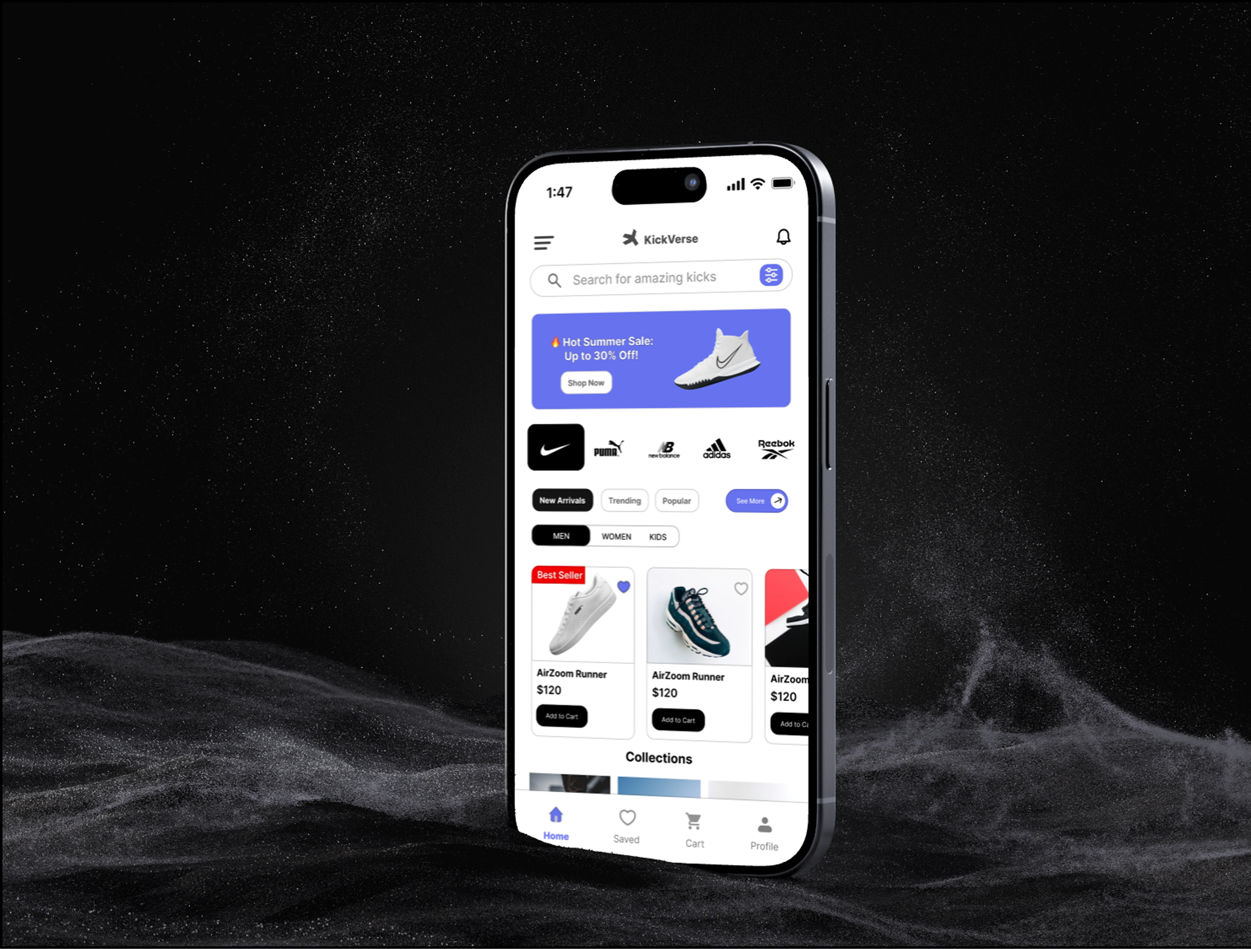 Kickverse is a mobile-first sneaker e-commerce app designed to offer a smooth, engaging, and highly visual shopping experience. The app bridges the gap between digital and physical retail by showcasing sneakers with rich imagery, intuitive navigation, and efficient purchase flows.